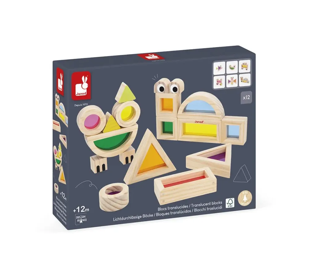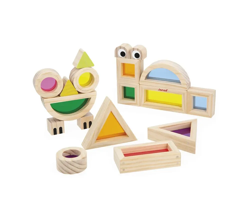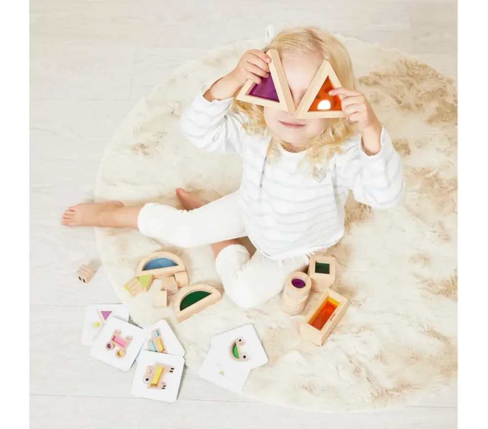 Un set di costruzioni in legno con dei particolari inserti colorati traslucidi, perfetti per un gioco sensoriale a 360°. Un gioco di impilamento adatto già anche ai più piccoli, che si divertiranno a guardare attraverso i blocchi colorati, scoprendo anche come, sovrapponendoli, i colori cambiano.