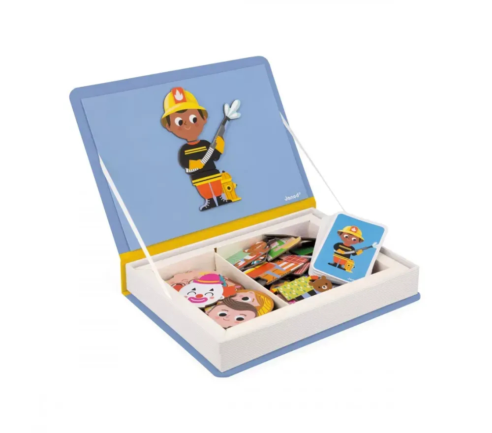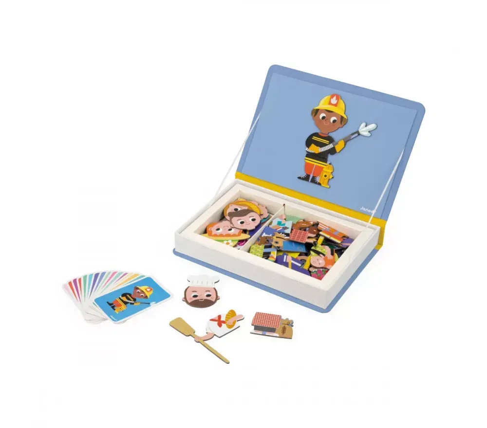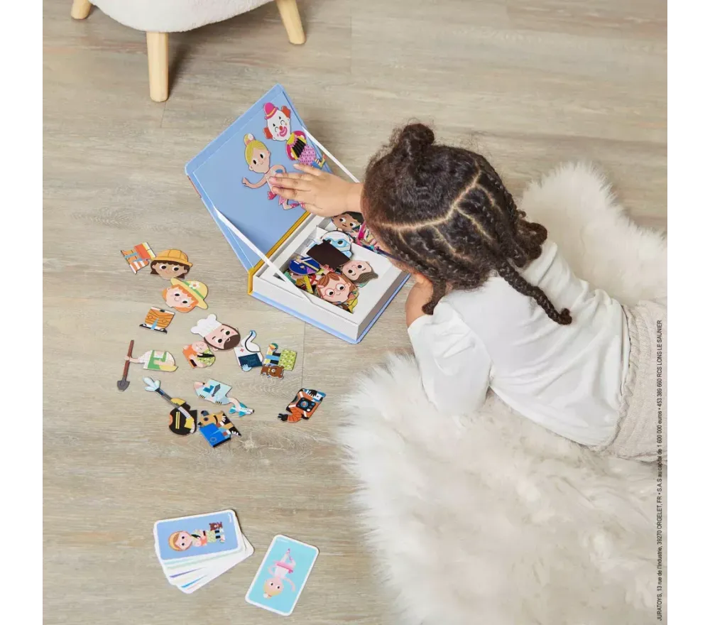 La simpatica scatola a forma di libro ha un lato magnetico sul quale le bambinei bimbi potranno sbizzarrirsi a ricreare 16 mestieri… e inventarne di nuovi.