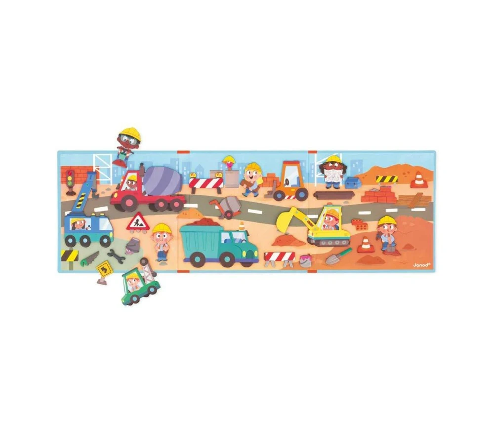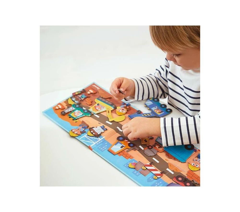 Una plancia di gioco magnetica e tanti magneti con cui inventare mille e più avventure a tema cantiere.