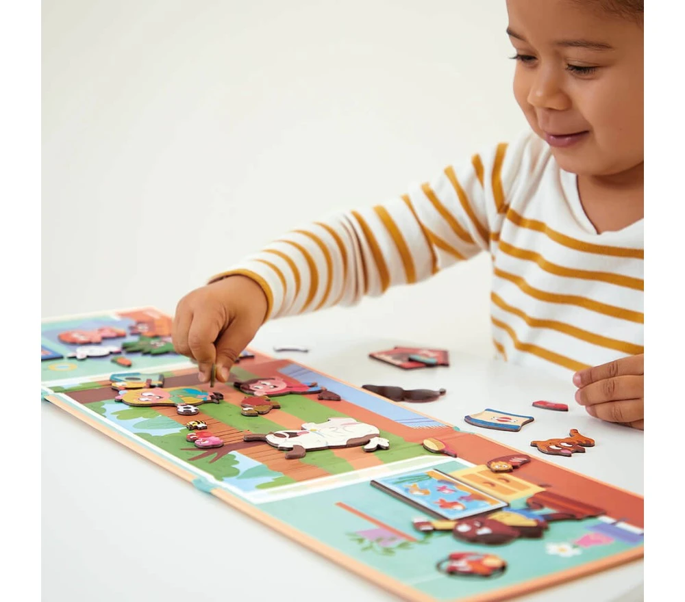 Una plancia di gioco magnetica e tanti magneti con cui inventare mille e più avventure a tema animali domestici.