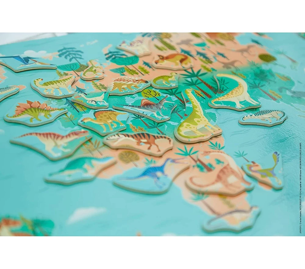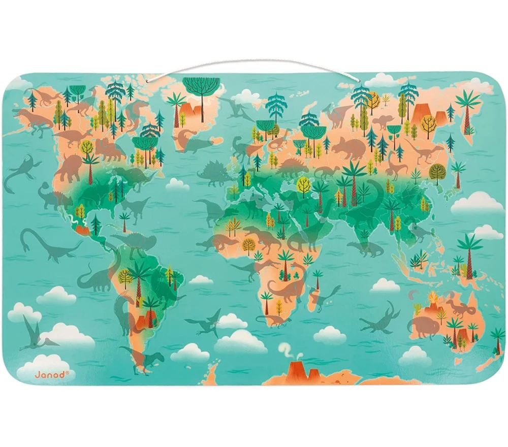 Un fantastico planisfero magnetico da appendere per scoprire dove vivevano le diverse specie di dinosauri. La confezione comprende 50 magneti e un poster che illustra i nomi di tutti i dinosauri raffigurati.