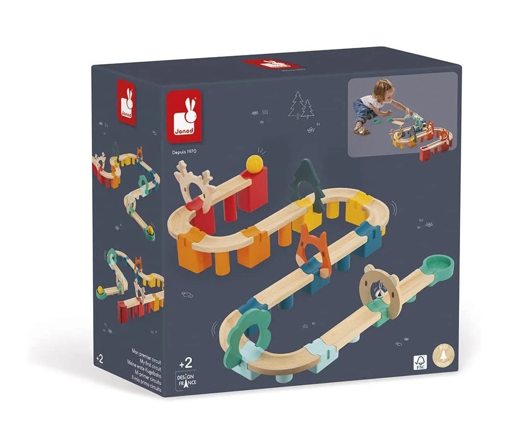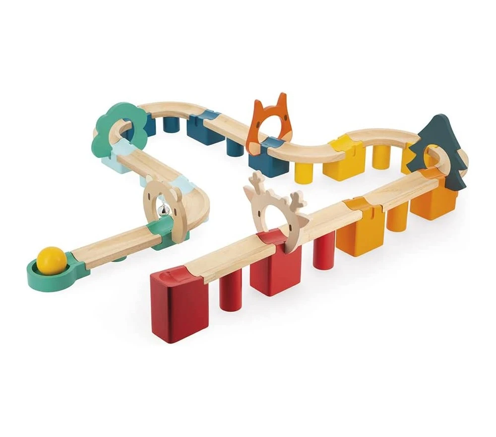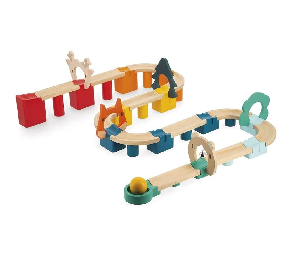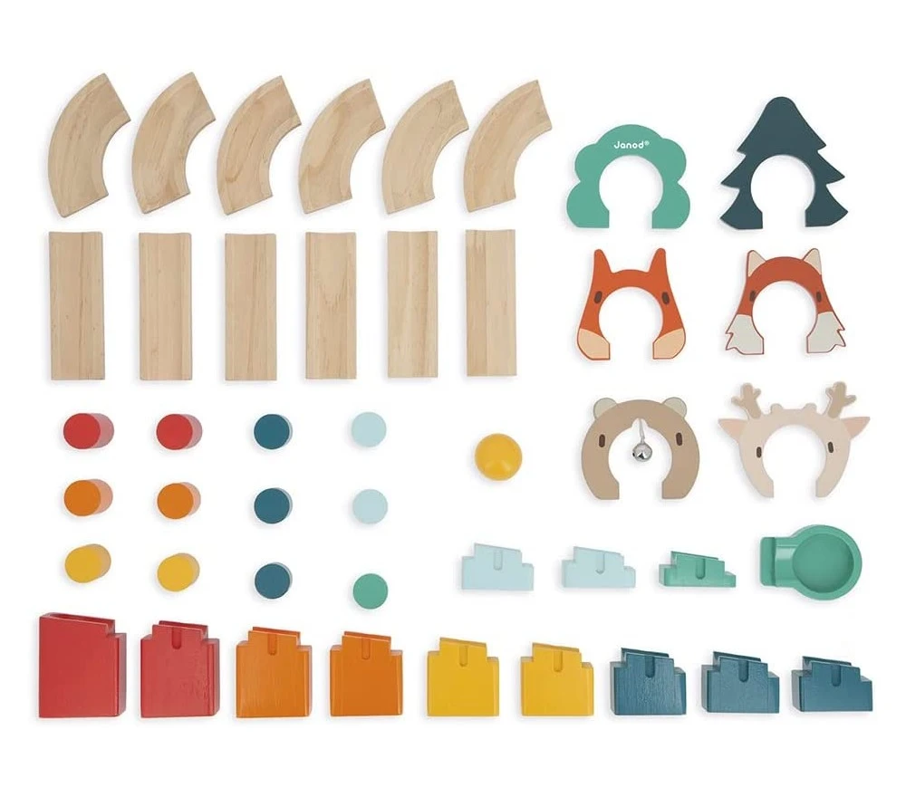 Il set include 44 pezzi in legno FSC con vernici a base di acqua: 13 connettori, 12 pilastri, 12 binari, 6 porte e 1 pallina.