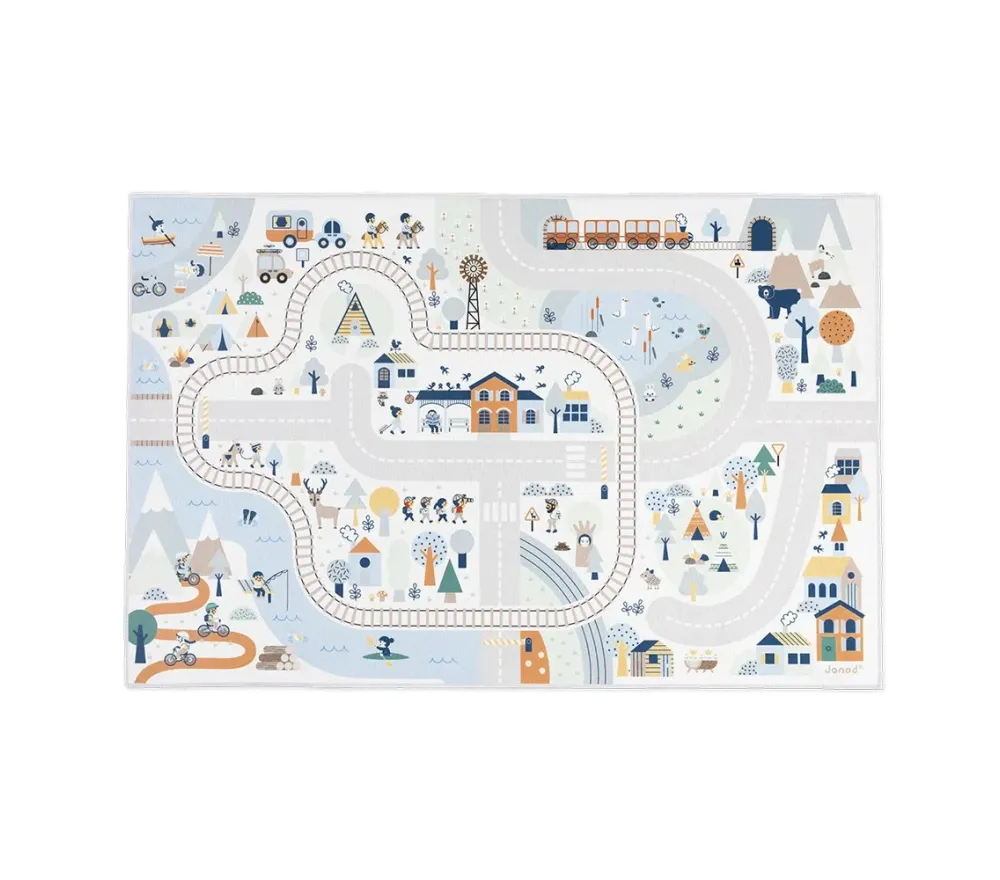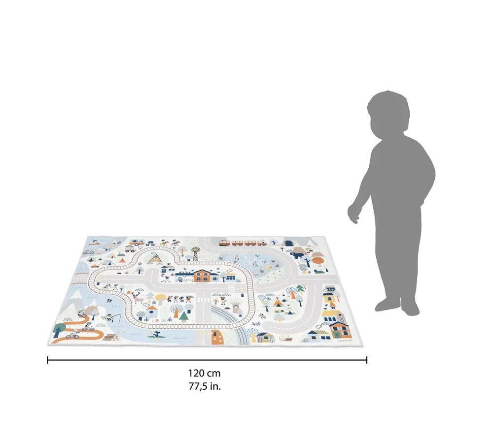 Un tappeto gioco che non solo renderà allegra la cameretta, ma intratterrà i bimbi per ore e ore di gioco! Sul tappeto gioco i bimbi potranno divertirsi sulle tortuose strade di montagna, alla ricerca di elementi nascosti: individueranno dove si trova il gattino, l’orso fuori dalla tana, si fermeranno al passaggio a livello quando si avvicina il treno e molto altro! Sono rappresentati tantissimi elementi naturali, animali e personaggi! Si parte in bicicletta dai passi di montagna, poi si fa un’escursione alla scoperta degli animali di montagna, prima di andare al centro ippico per una passeggiata a cavallo.