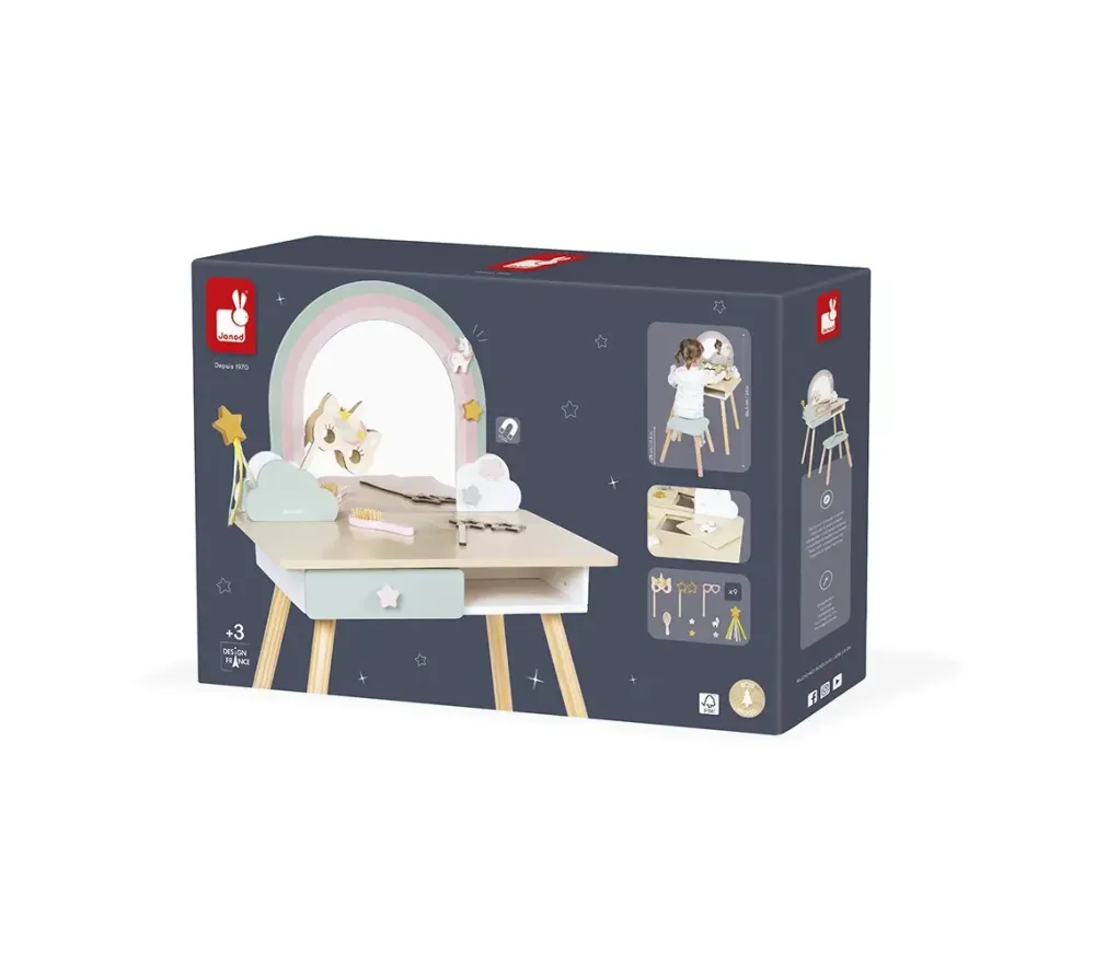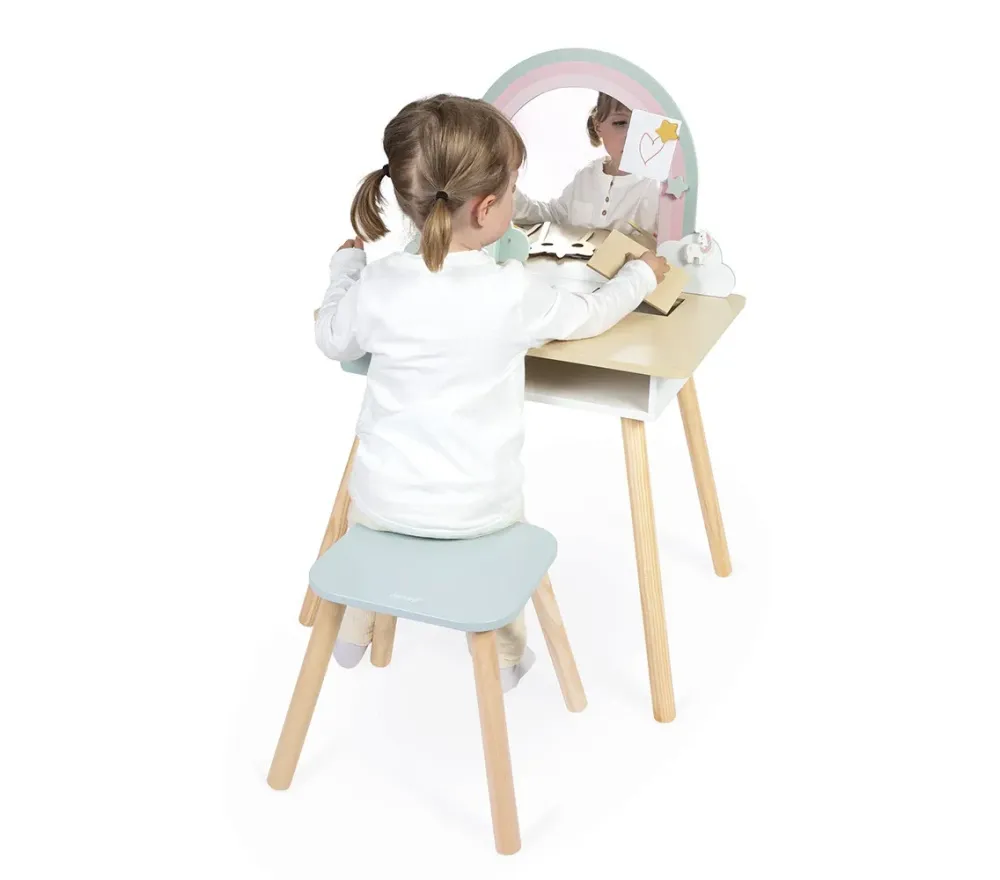 Fornita con 10 accessori, questa toeletta in legno garantisce ore di gioco e creeràun angolo elegante e moderno in ogni cameretta!.