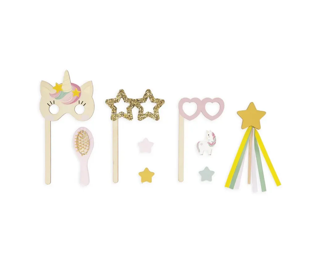 Oltre alla toeletta sono compresi: 1 spazzola per capelli, 1 bacchetta magica, 3 accessori photobooth per divertirsi davanti allo specchio e 4 magneti a forma di stelle e unicorno utili per appendere disegni o foto sulla toeletta!