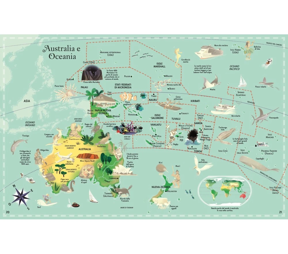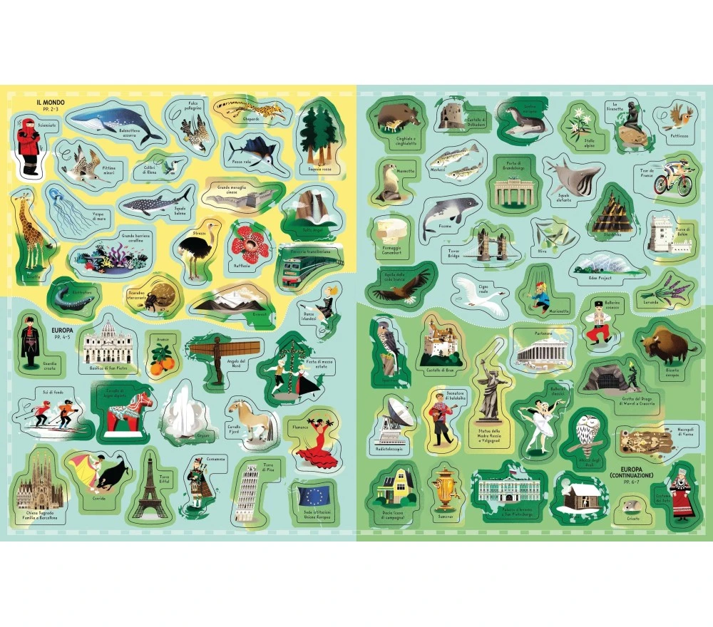 Splendide cartine e oltre 350 adesivi per viaggiare dappertutto e scoprire non solo i luoghi e i monumenti più famosi, ma anche popolazioni e animali sconosciuti.