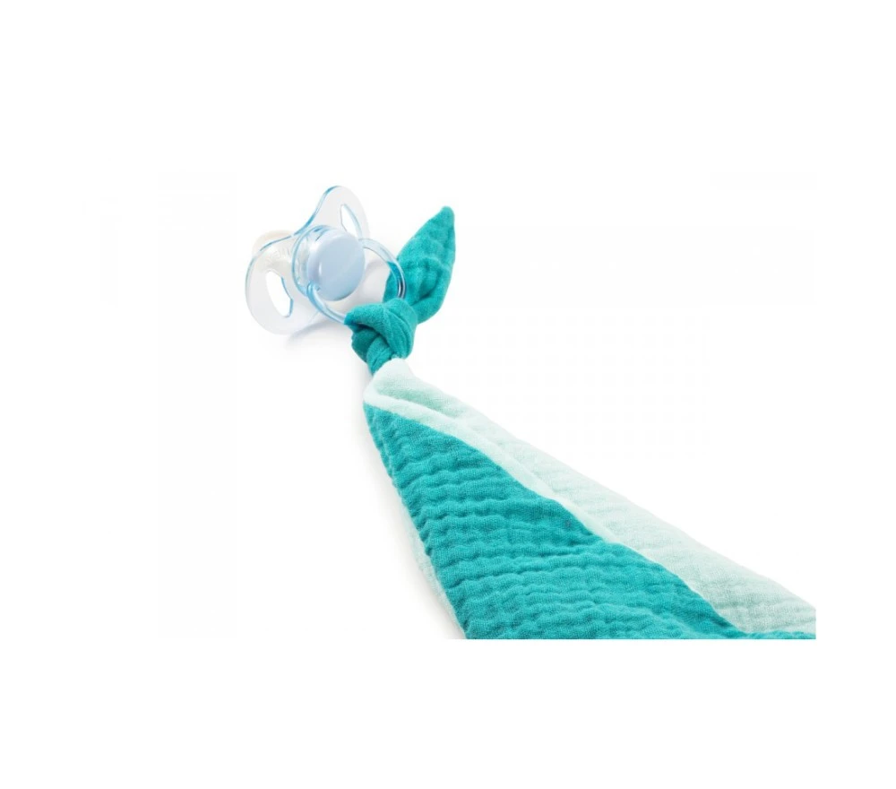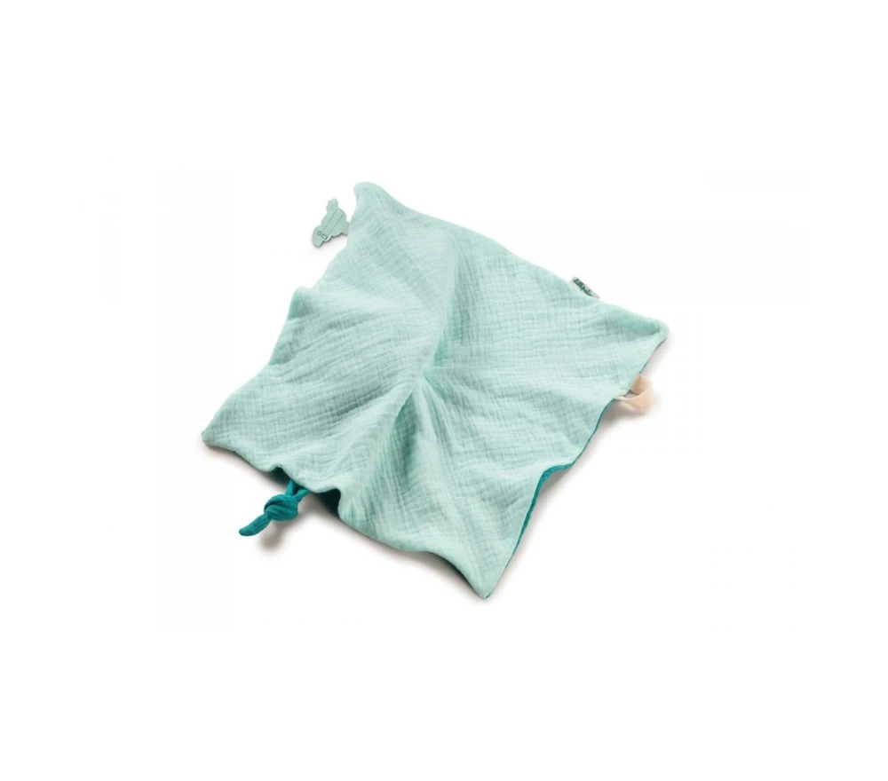 Il doudou ha anche un lembo da annodare, perfetto per tenere il ciuccio o da mordicchiare. Da 0 mesi.