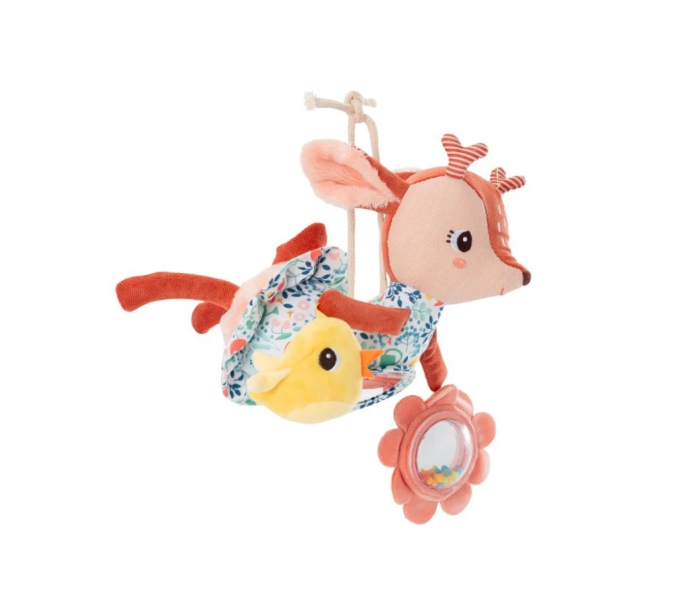 Un gioco morbido e con stimoli diversi, per intrattenere i bimbi a casa e in giro! Il gioco multiattività di Stella il servo ha un sonaglino interno, uno specchietto sulla pancia, un uccellino che fruscia e un fiore sonaglino con specchietto e palline. Grazie ai laccetti è possibile appenderlo dove si desidera (ovetto, passeggino, lettino ecc).