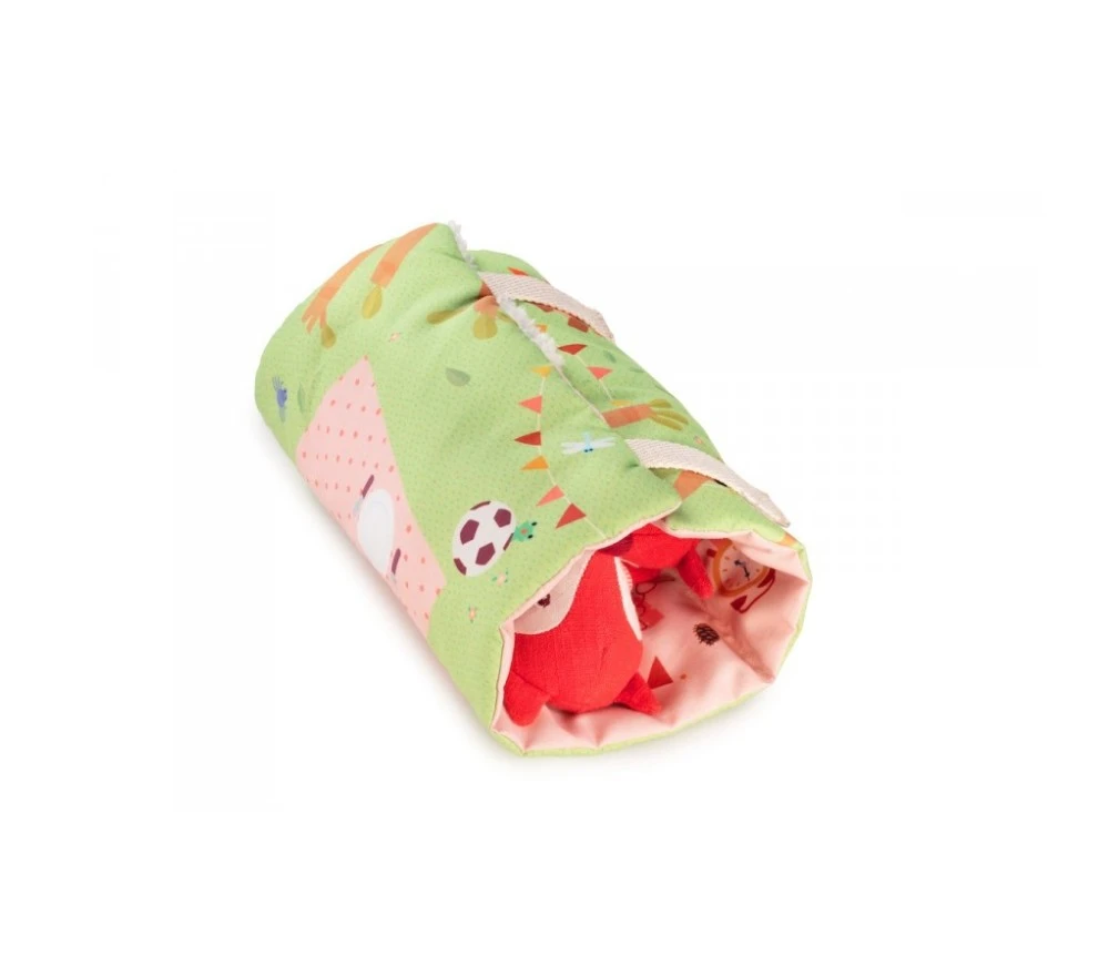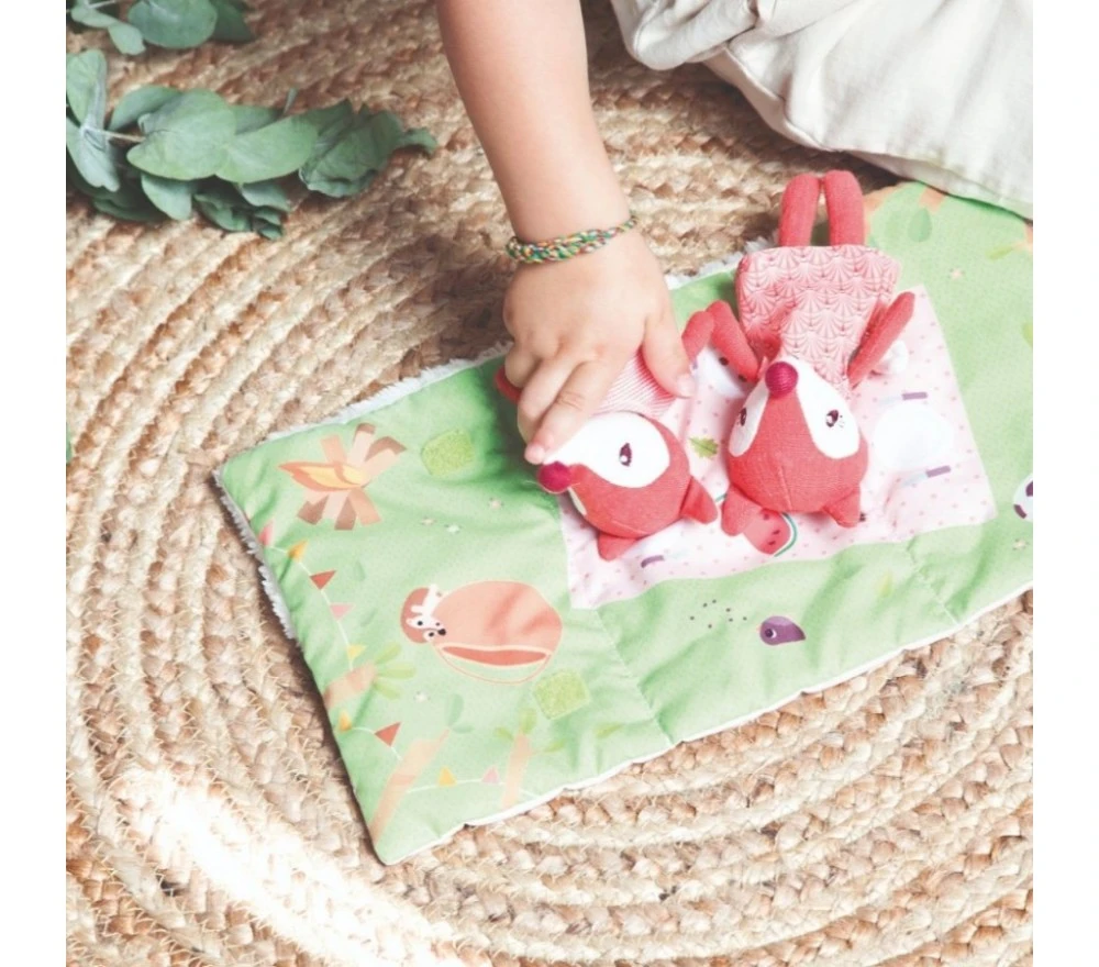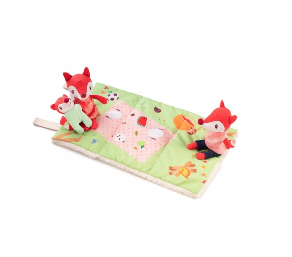 Un set gioco con Alice la volpe, mamma e papà che trascorrono una bella giornata all’aperto con un gustoso picnic. Dopo tanto giocare ci vuole un po’ di riposo: girando lo scenario-tappeto troviamo 3 lettini morbidissimi, dove fare una nanna serena!. Il tappeto si arrotola e si chiude con il velcro, per portare i personaggi sempre con sè e vivere mille e più avventure!