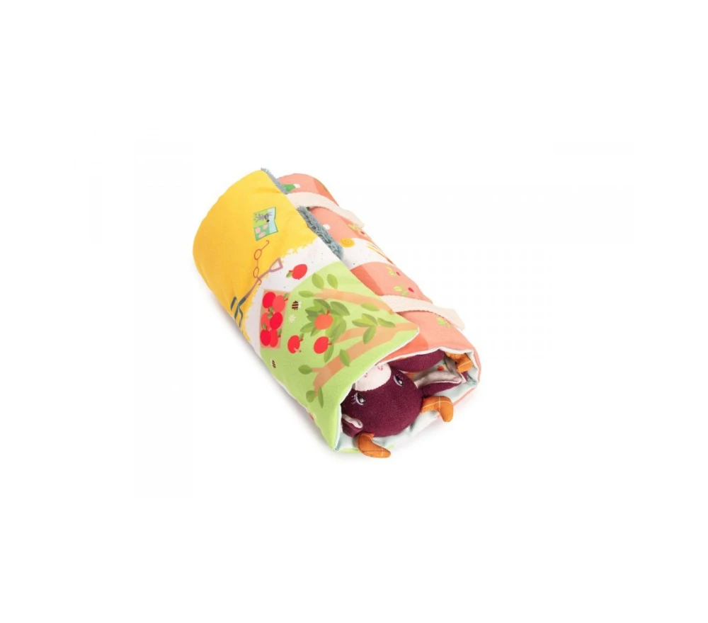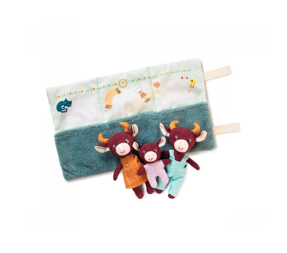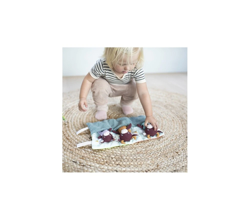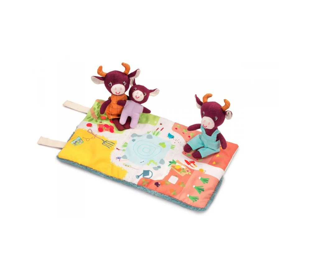 Un set gioco con Rosalie la mucca, mamma e papà che trascorrono una bella giornata all’aperto nella fattoria, tra mille attività. Dopo tanto giocare ci vuole un po’ di riposo: girando lo scenario-tappeto troviamo 3 lettini morbidissimi, dove fare una nanna serena!. Il tappeto si arrotola e si chiude con il velcro, per portare i personaggi sempre con sè e vivere mille e più avventure!