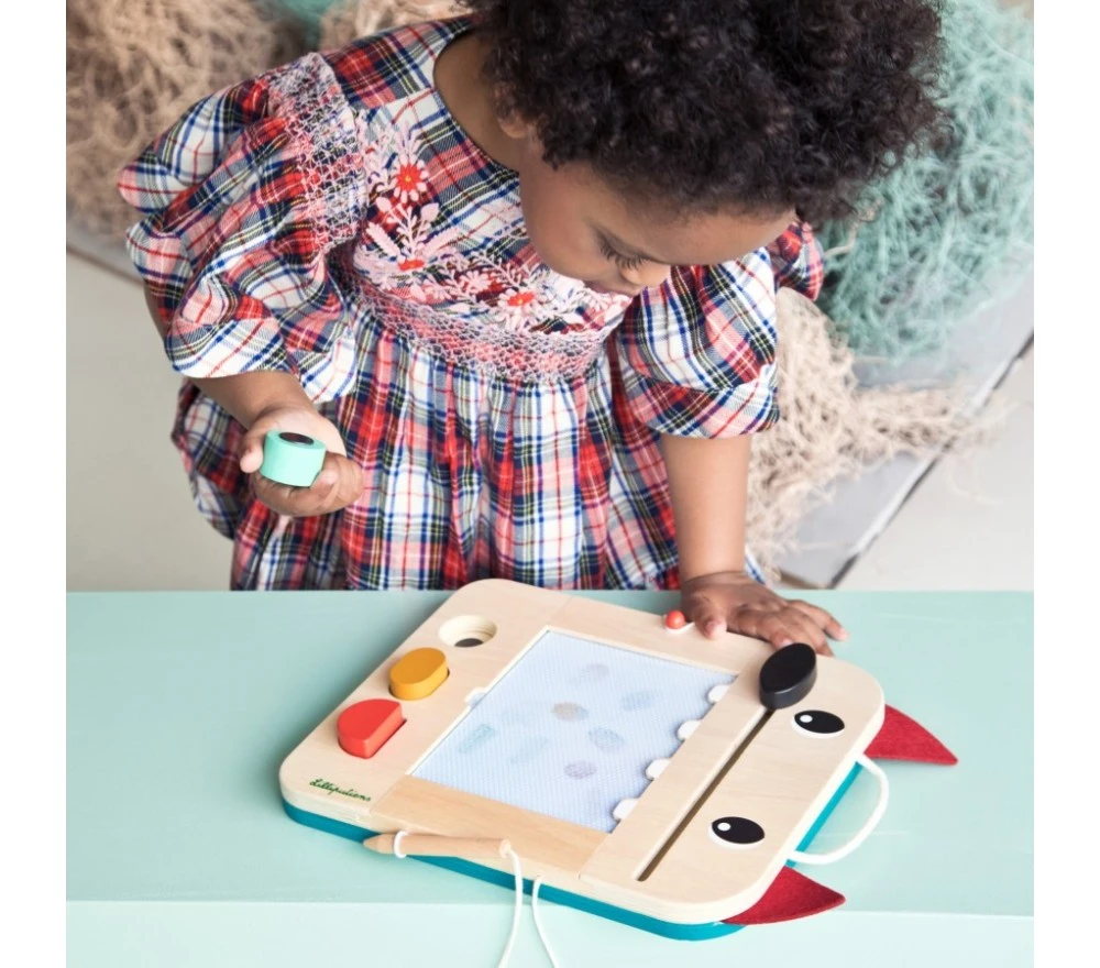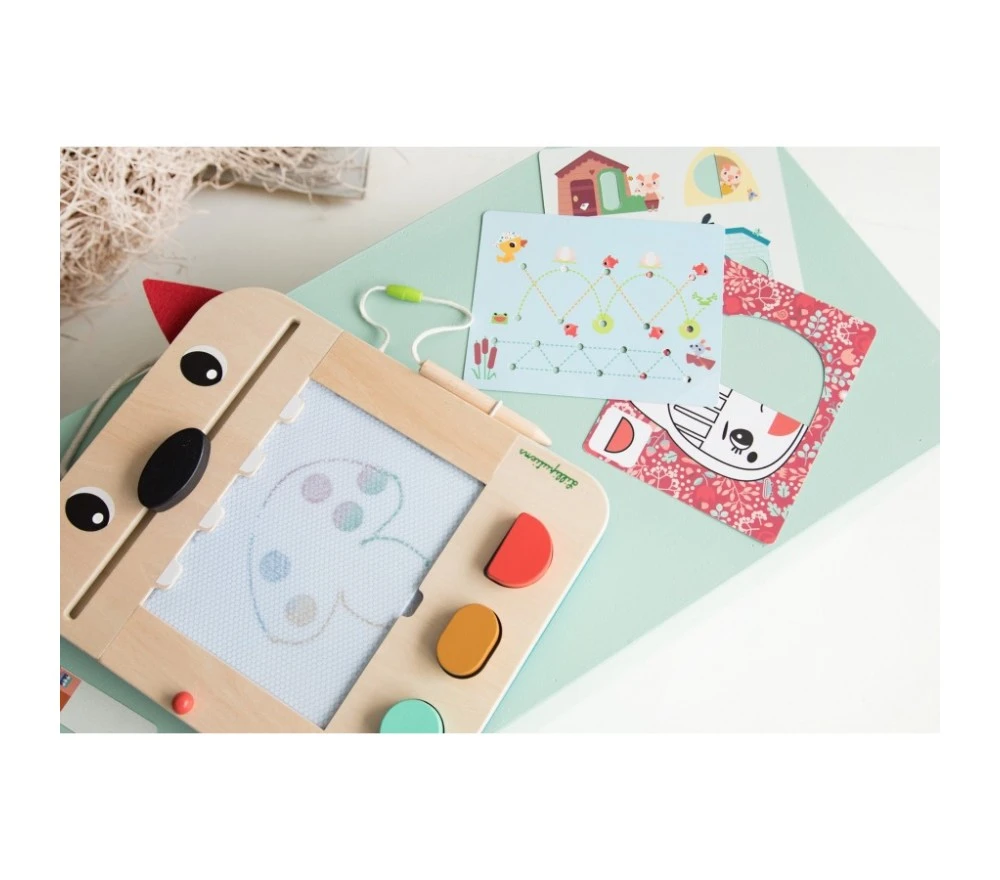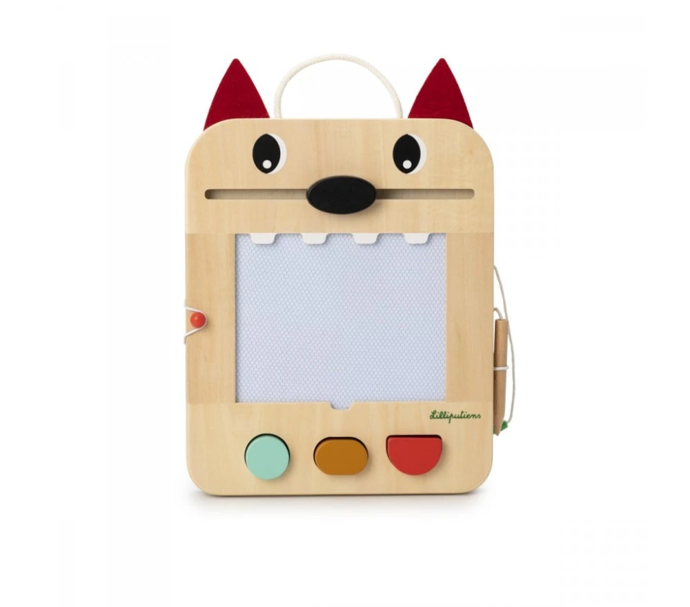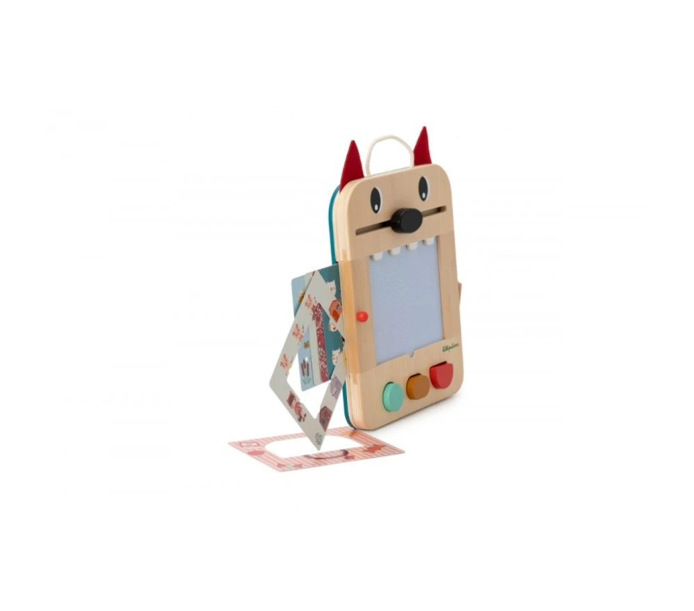 La lavagna magica di Louis il lupo è perfetta per disegnare all’infinito! Con la penna in legno (legata, per non perderla!) si scrive o si disegna sulla superficie cerata, che svelerà tre colori diversi. La lavagnetta è inoltre dotata di 3 timbri, 6 schede intercambiabili per fare 12 giochi diversi per stimolare la mente e la creatività!