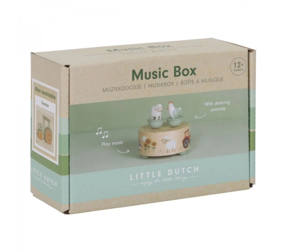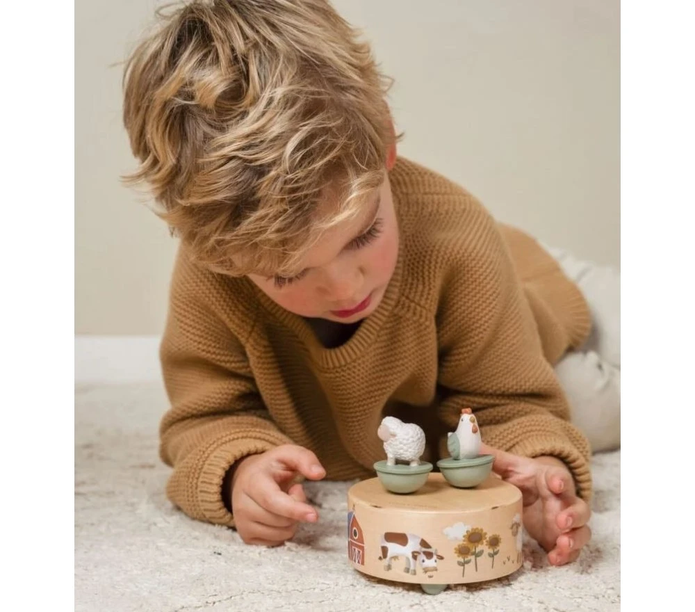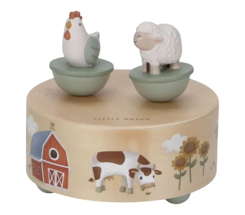 Un simpatico carillon in legno con due personaggi della fattoria Little Farm magnetici. Basterà azionare il meccanismo e, oltre ad ascoltare una dolce melodia, i bimbi si divertiranno a veder piroettare la gallina e la pecorella sul carillon!