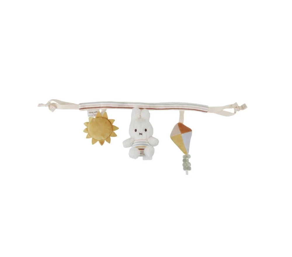 Dalla linea Miffy di Little Dutch, una allegra catena passeggino o ovetto, con morbidi elementi che stimolano i sensi e la coordinazione occhio-mano: sonaglino, squeaker e gioco frusciante.