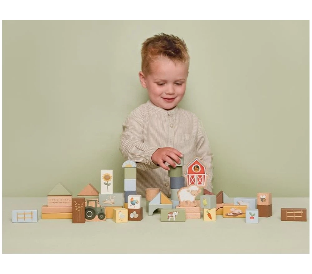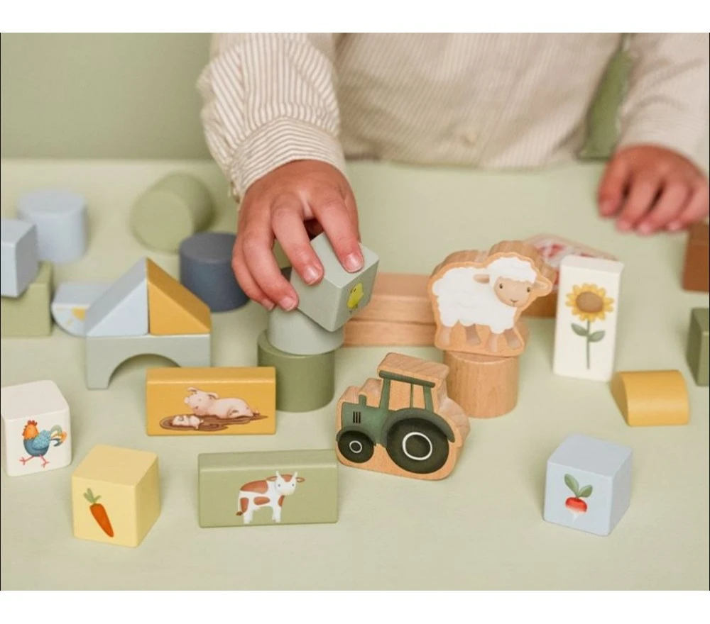 Questi blocchi in legno sono un classico delle costruzioni! La pratica confezione rotonda con coperchio e maniglia contiene 50 blocchi in legno di betulla con vernici ad acqua, con tenui colori sui toni del verde e a tema fattora.