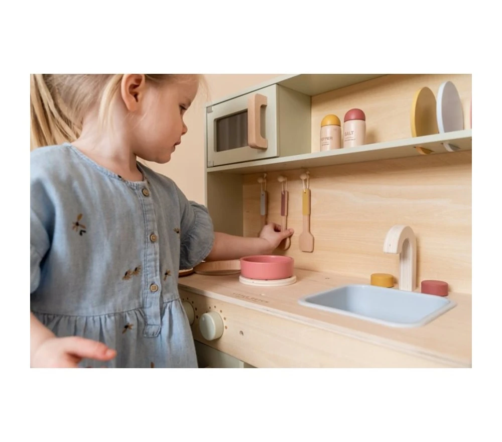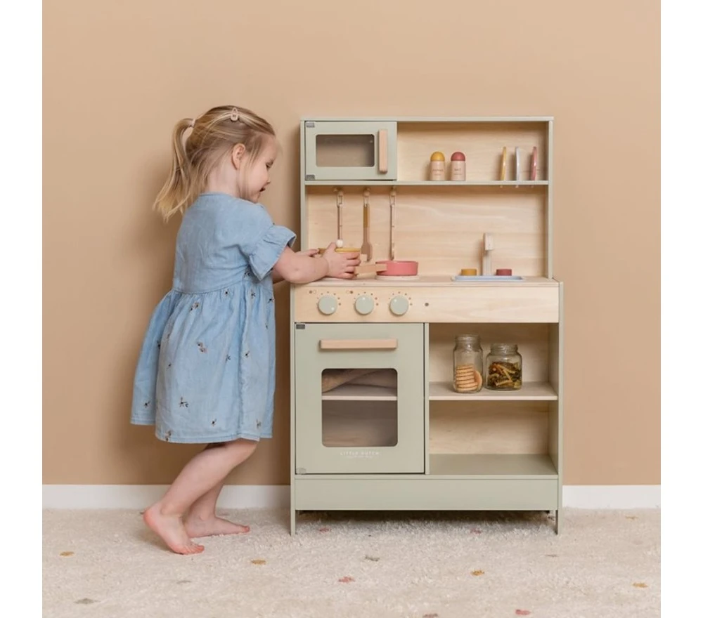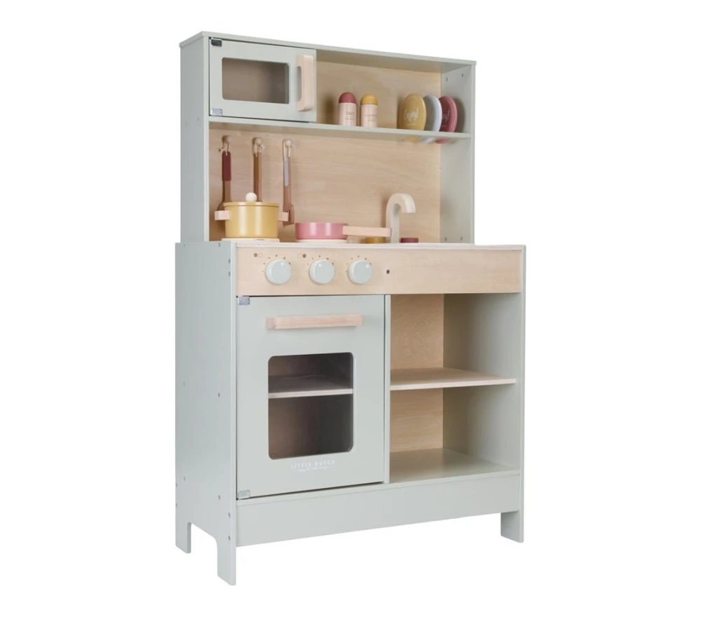 Una rivisitazione della classica cucina in legno dallo stile inconfondibile di Little Dutch. Curata nei dettagli e dagli splendidi toni pastello è divertentissima da usare e bella da vedere! La cucina ha un forno apribile con un ripiano, due spazi sotto il top per riporre gli attrezzi, un lavandino con rubinetto.