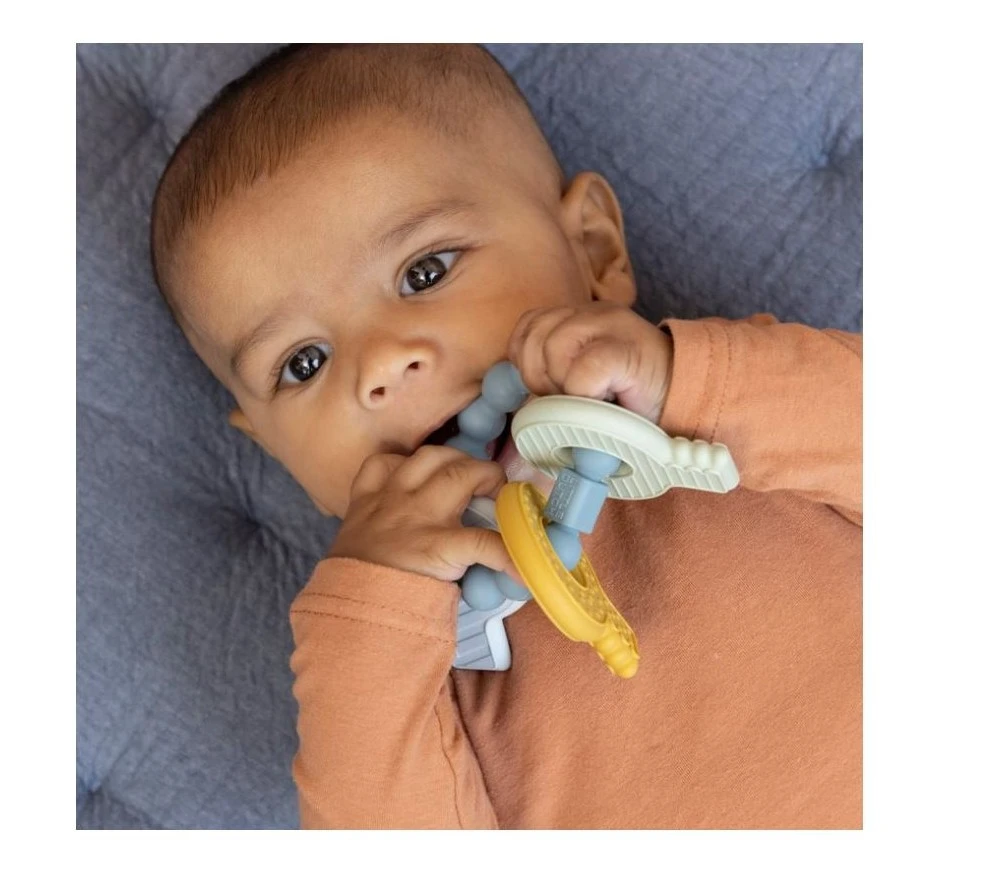 Un coloratissimo dentaruolo per la dentizione in silicone dalle forme e texture diverse, per stimolare i sensi dei più piccoli e alleviare i fastidi della dentizione. Da 4 mesi in su.
