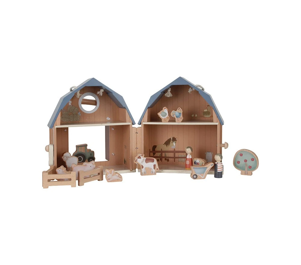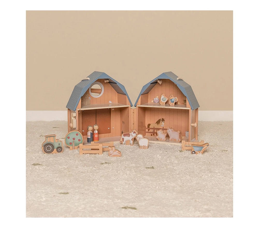 Una fantastica fattoria in legno che si apre e nasconde un piccolo mondo in miniatura! 16 figurine in legno completano lo scenario e permettono di inventare mille e più storie!