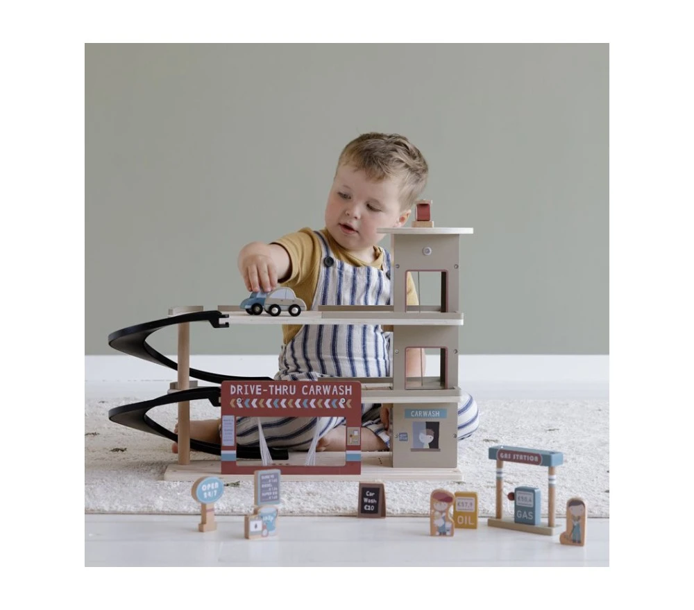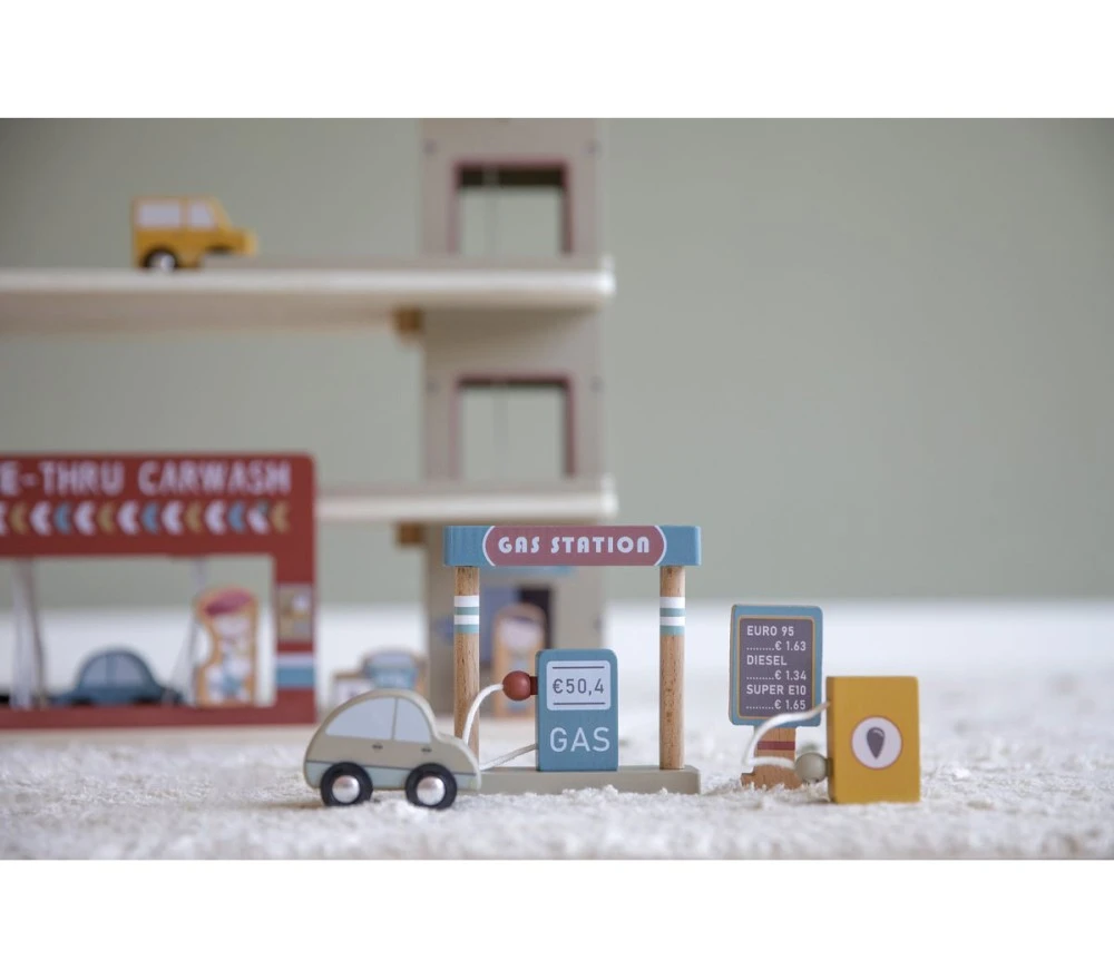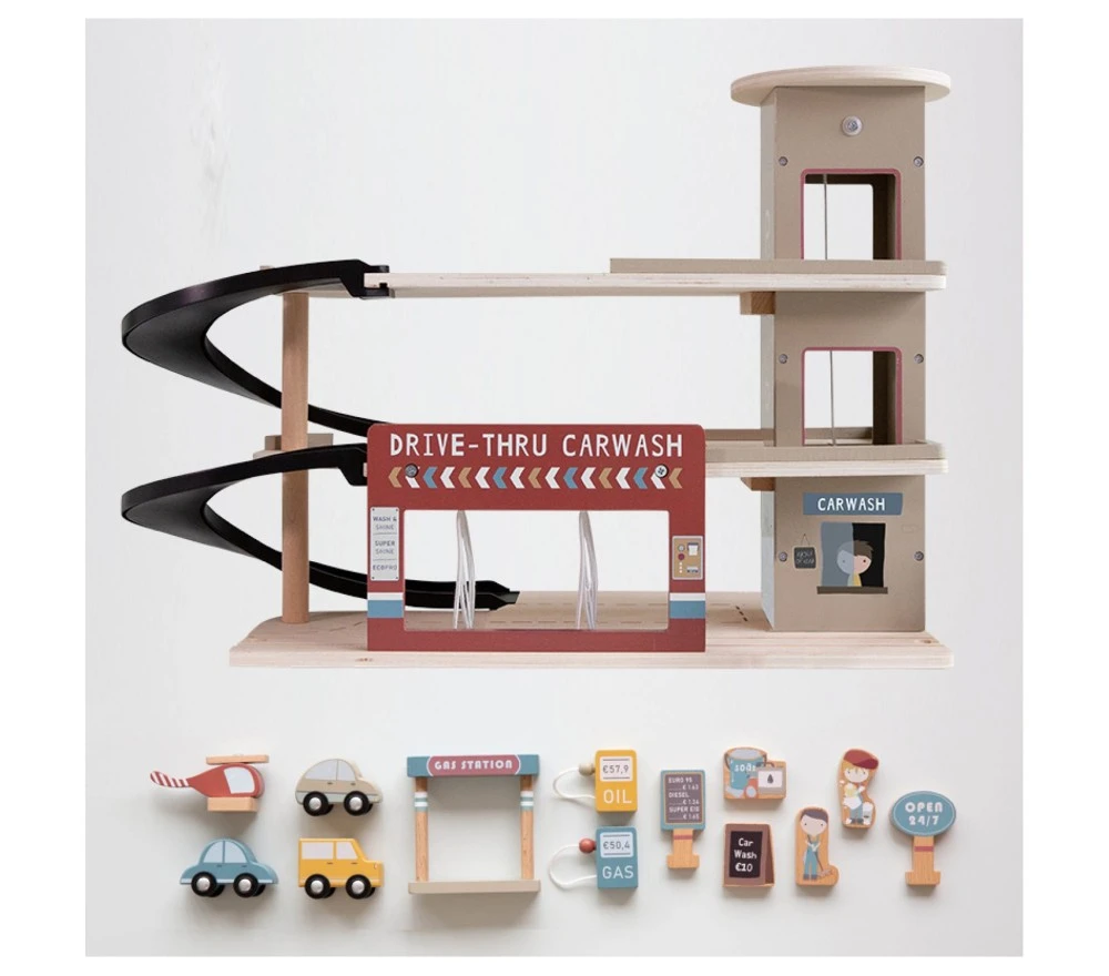 Un garage in legno FSC ricco di dettagli a cui non manca proprio nulla: pompa di benzina per un rifornimento al volo,un comodo parcheggio, un lavaggio auto per far risplendere le vetture, una piattaforma per l’atterraggio degli elicotteri e un ascensore manuale! Il set include anche 3 veicoli, 1 elicottero, 2 personaggi e diversi accessori. Il garage può anche essere un complemento alla ferrovia in legno (ha un’innesto per collegarlo alla pista).