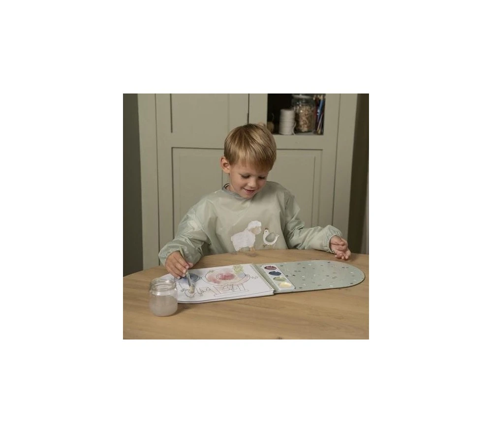Un grembiule perfetto per proteggere gli abiti durante le attività creative. Si mette e si toglie facilmente grazie al velcro sul retro. Le maniche hanno il polsino elastico.