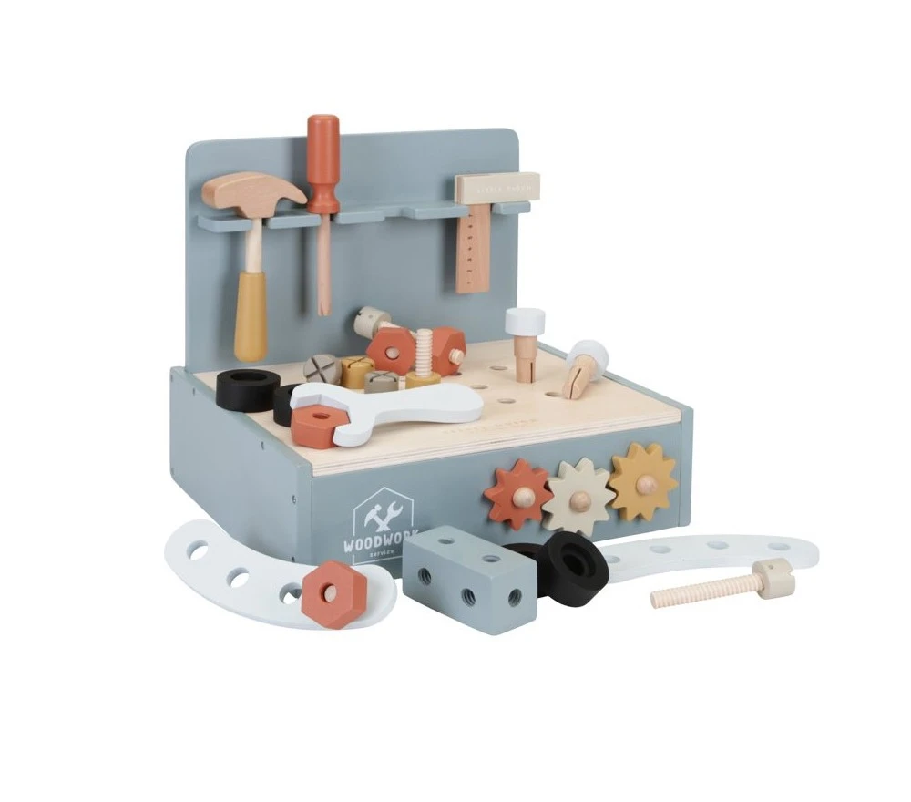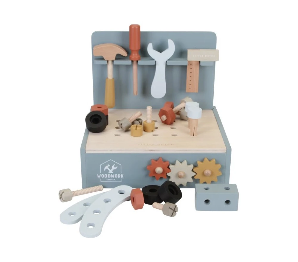 Un banco da lavoro compatto, perfetto per allenare la manualità e la fantasia dei bimbi. Con martello, cacciavite, chiave inglese e squadra i bimbi potranno imitare i grandi e imparare ad avvitare e svitare viti e bulloni. In legno FSC.
