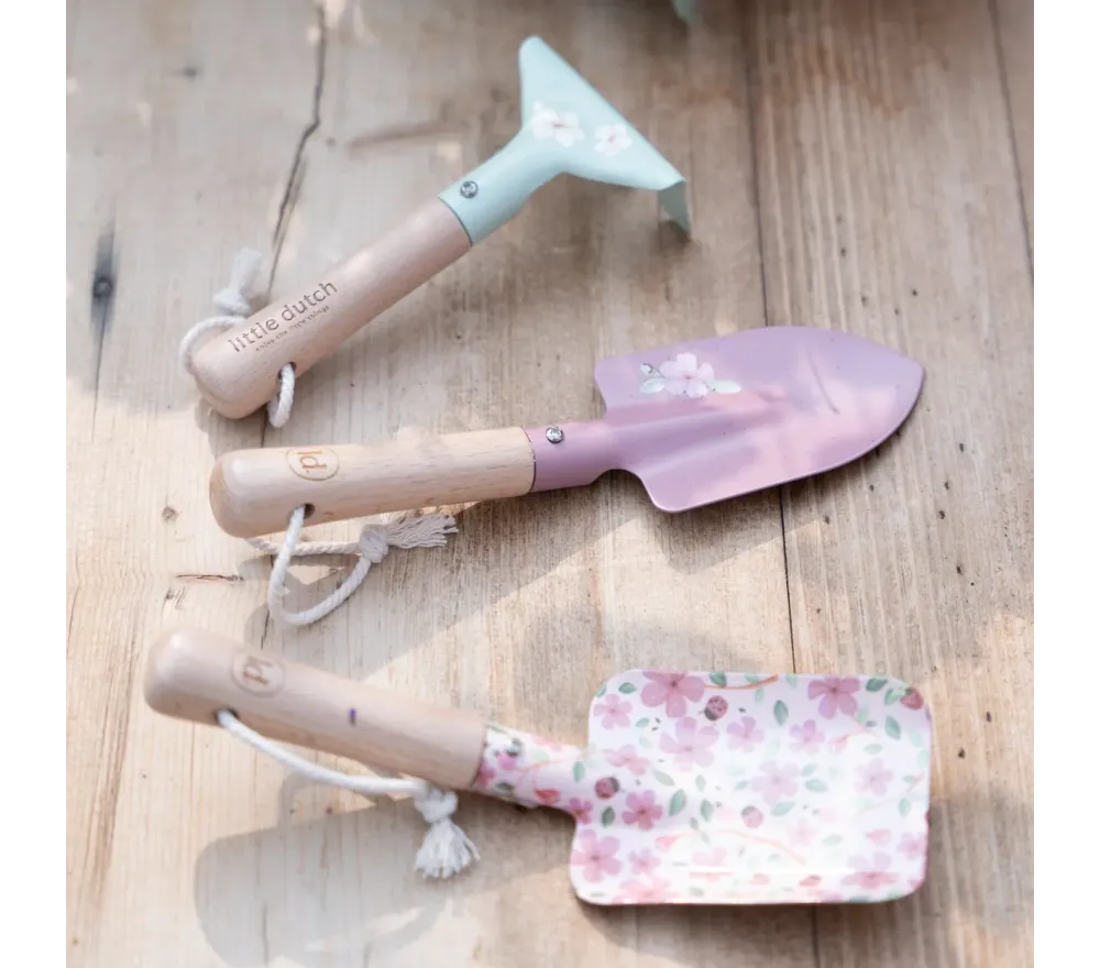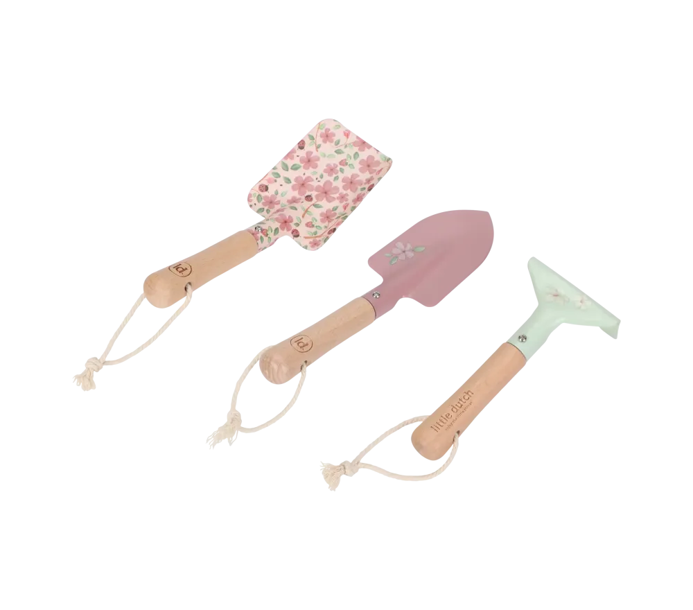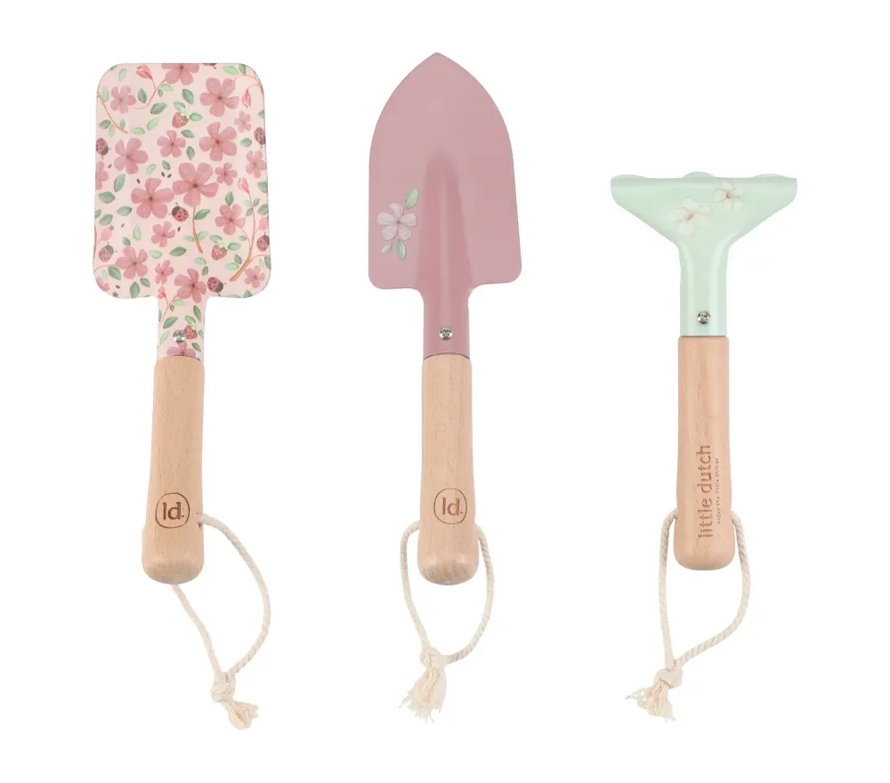Ecco degli strumenti perfetti per i piccoli giardinieri in erba! Due pale e un rastrello in metallo con manici in legno per scoprire le gioie del giardinaggio.