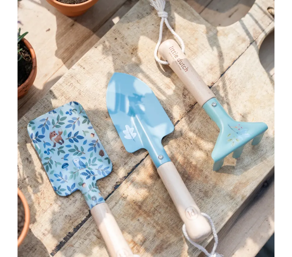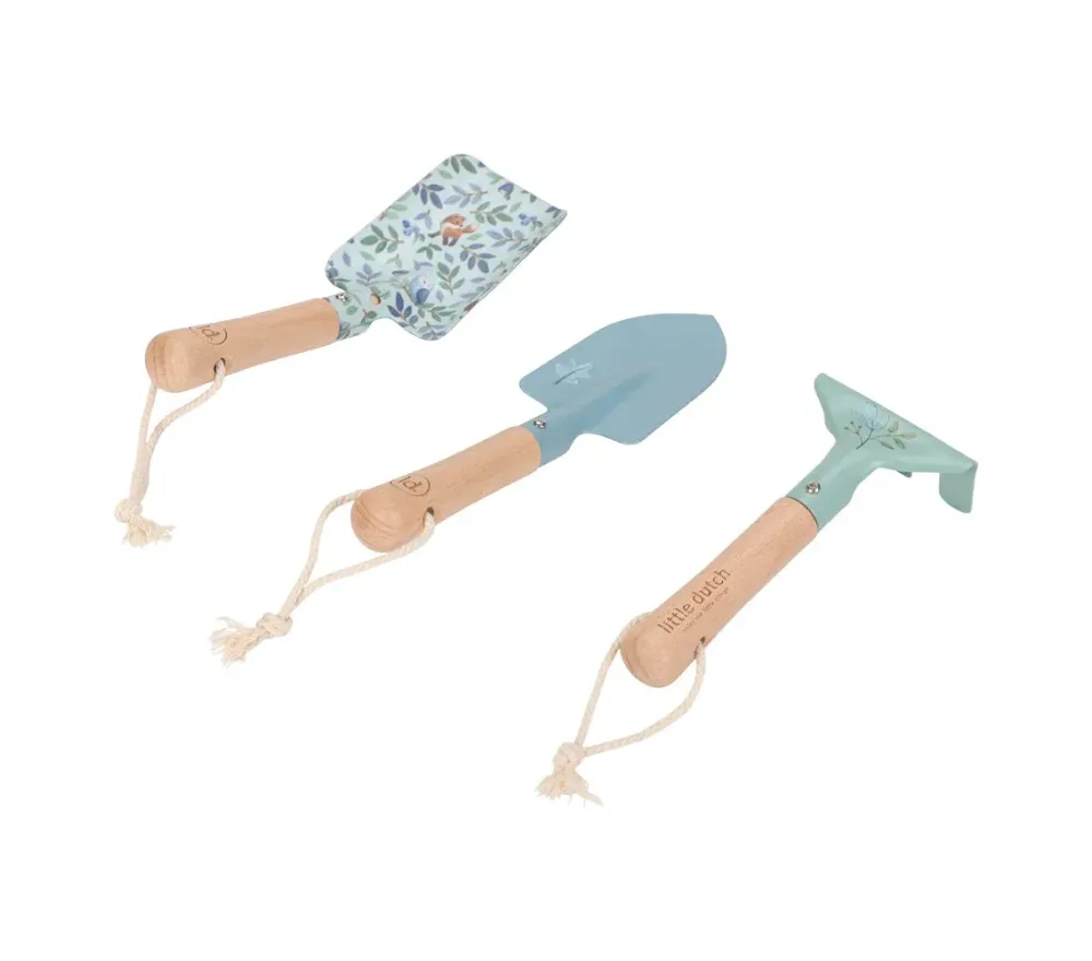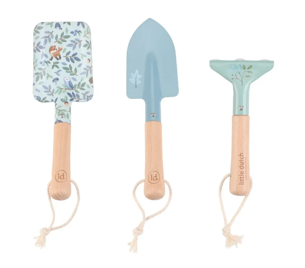 Ecco degli strumenti perfetti per i piccoli giardinieri in erba! Due pale e un rastrello in metallo con manici in legno per scoprire le gioie del giardinaggio.