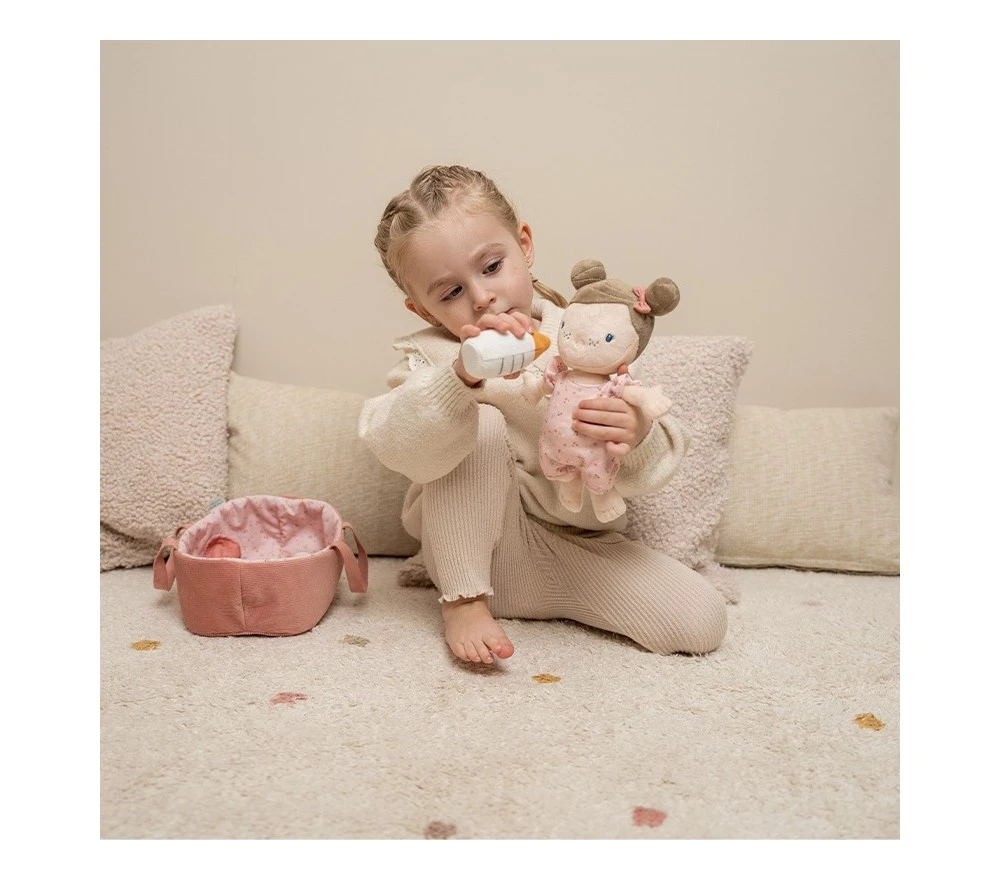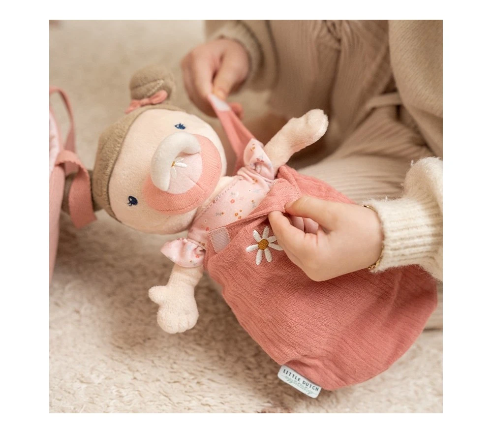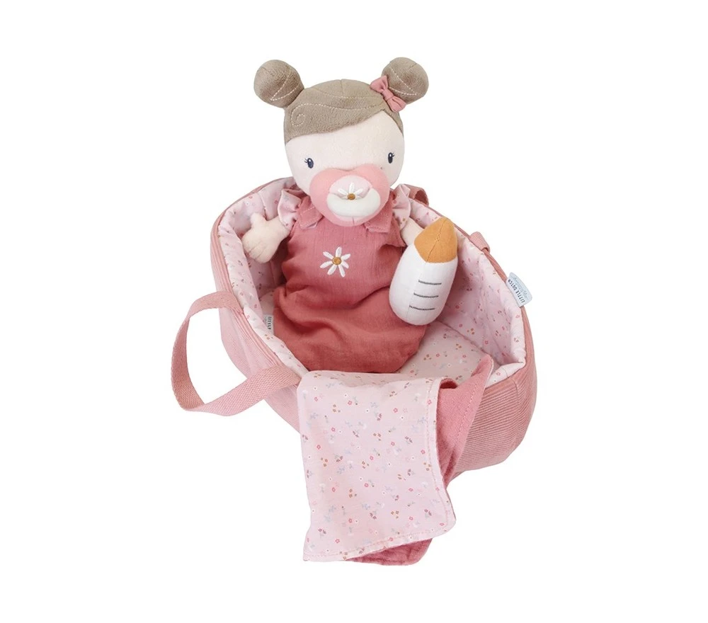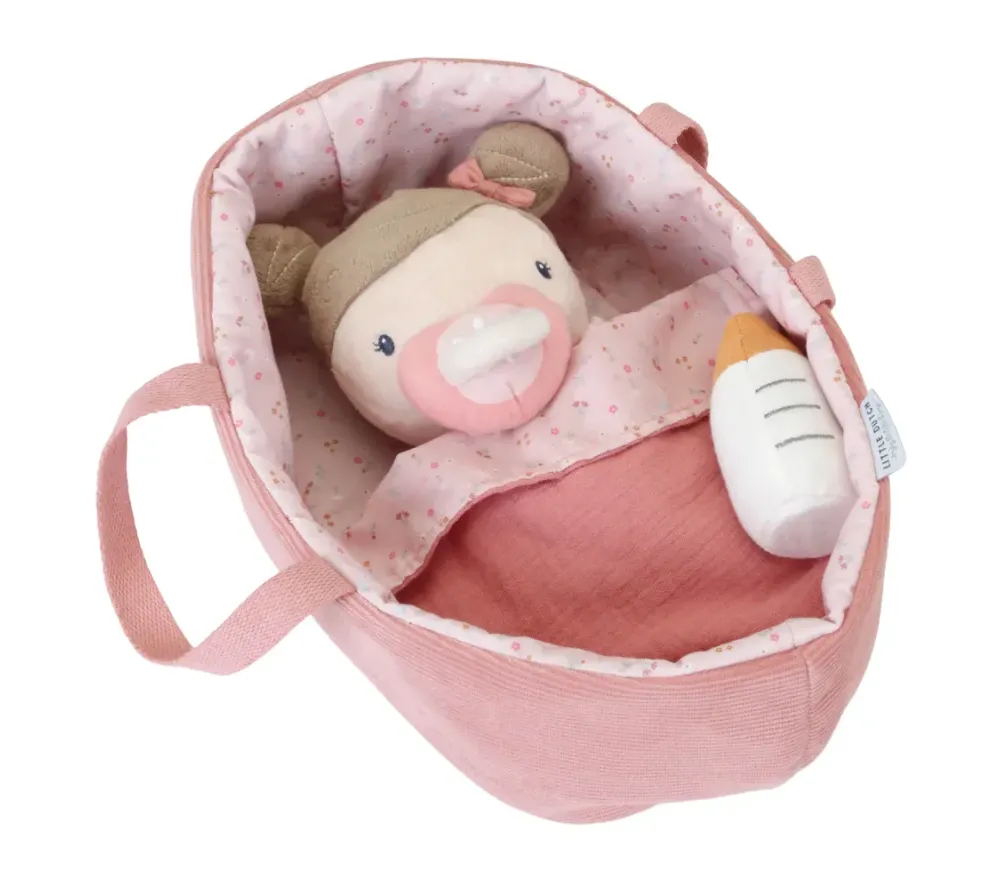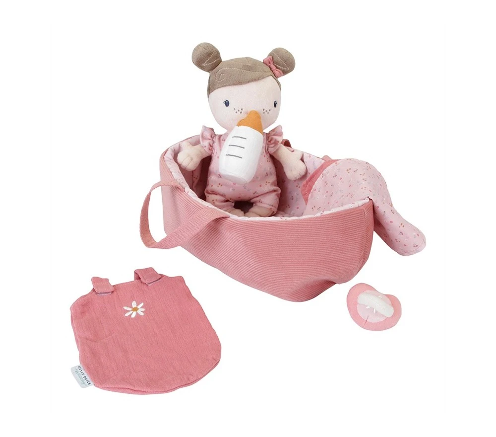 Rosa è una dolce e morbida bambola in stoffa, con tanti accessori con cui prendersi cura di lei! E’ possibile darle da mangiare con il biberon o calmarla con il cuccio (entrambi magnetici). Ha inoltre un comodo sacco nanna e un porta-enfant per i viaggi. Inoltre ha anche una copertina e tutina e pannolino si possono mettere e togliere.