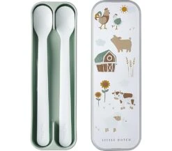 Un set di due cucchiaini sottili e lunghi, perfetti per lo svezzamento, dotati di una pratica custodia per portarli sempre con sè anche fuori casa.