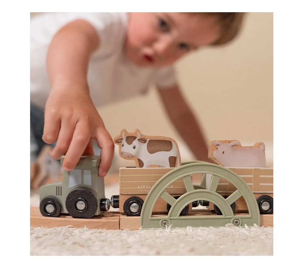 Un simpatico primo set con ferrovia e trenino In legno che viaggiano intorno a una piccola e adorabile fattoria! Le figurine e i vari elementi hanno originali illustrazioni in pieno stile Little Dutch su entrambi i lati, per ore e ore di gioco d’immaginazione.