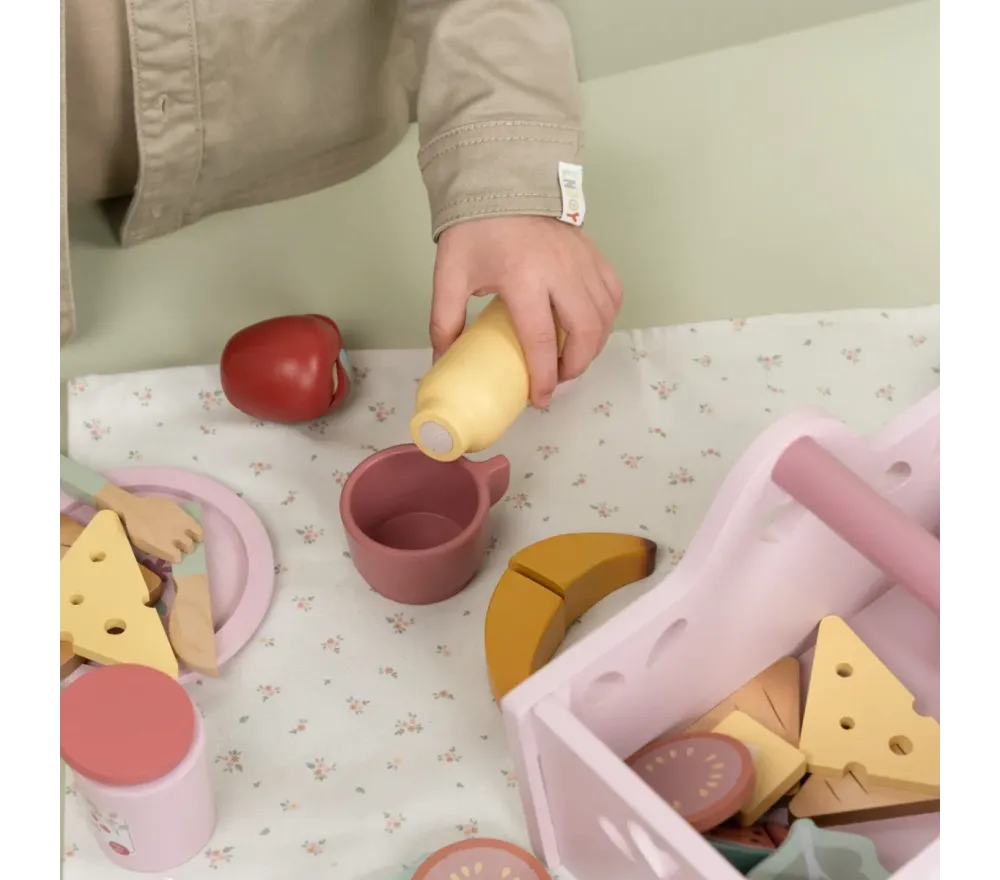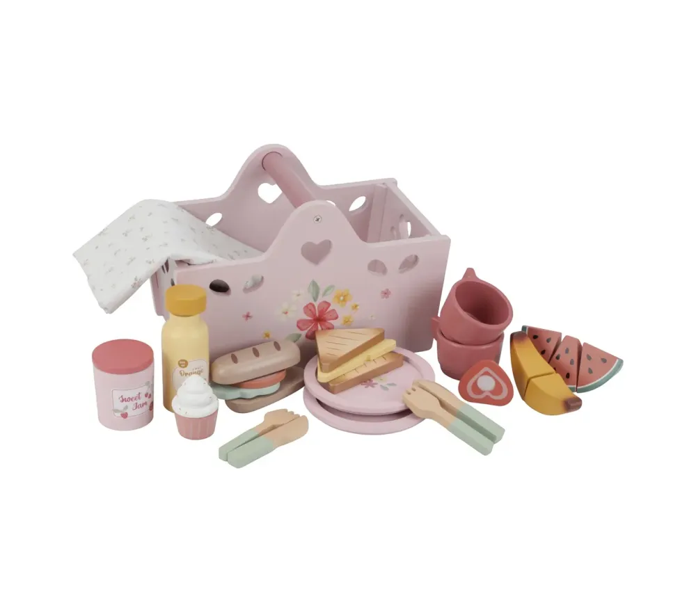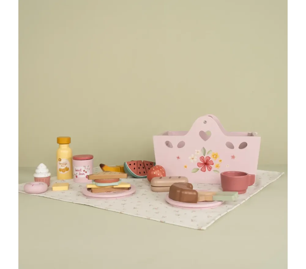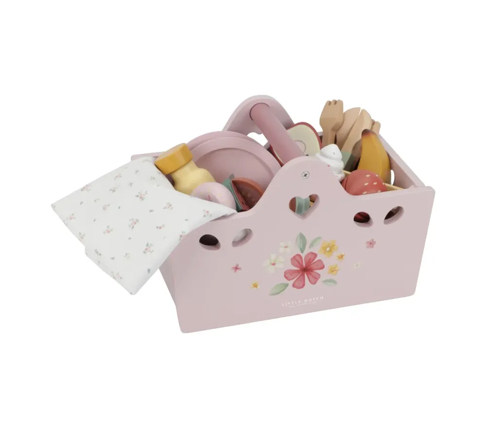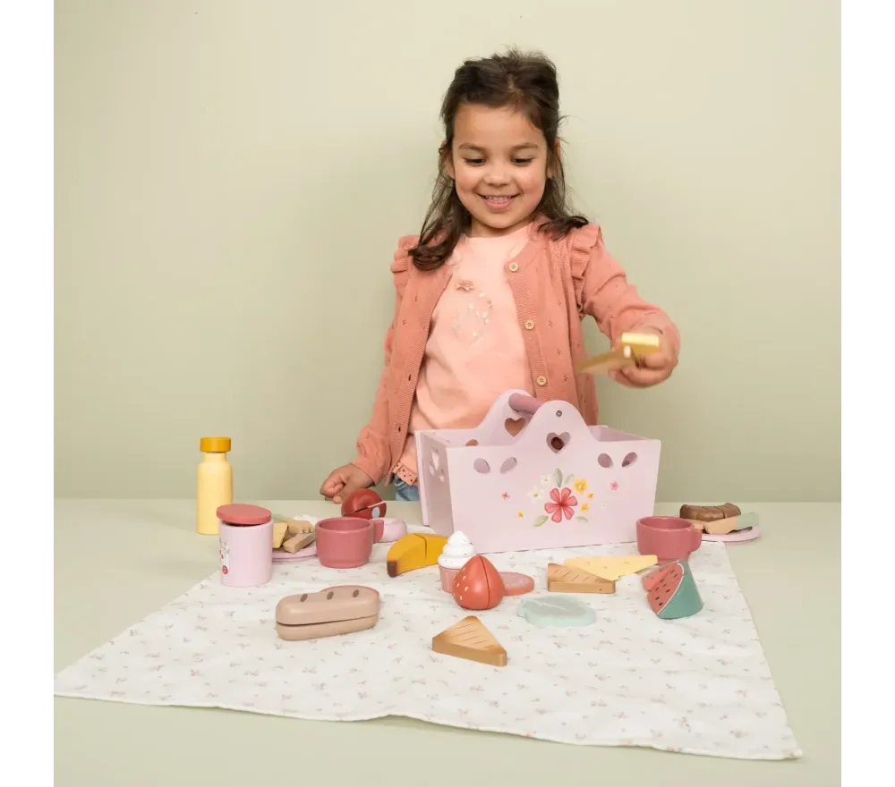 Un meraviglioso set da picnic in legno, con tantissimi accessori. Stoviglie, tovaglietta a tante prelibatezze dolci e salate, per tutti i gusti!
