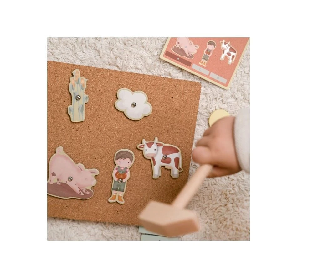 Il set contiene: 1 base in sughero, 1 martello in legno, forme geometriche in legno e cartone robusto, 5 esempi e 70 chiodini.