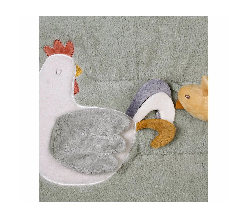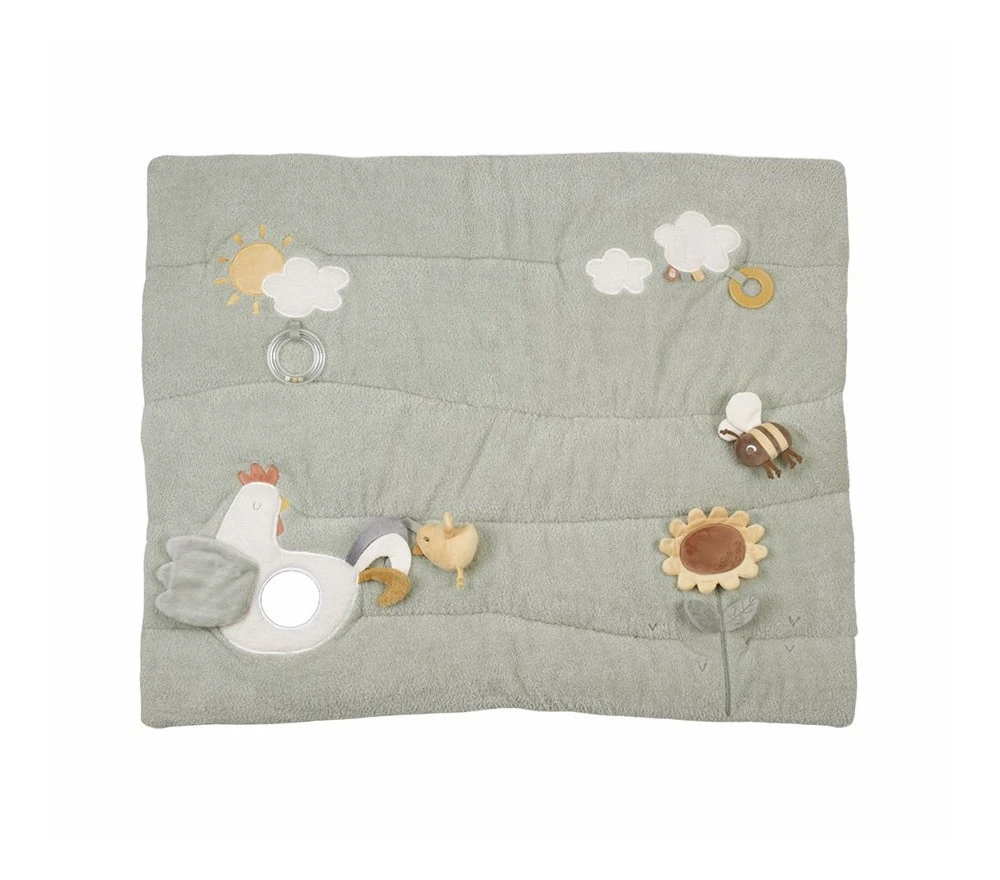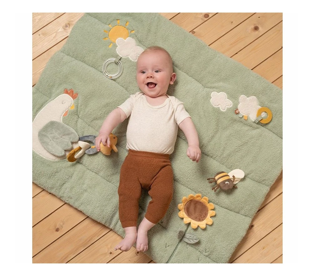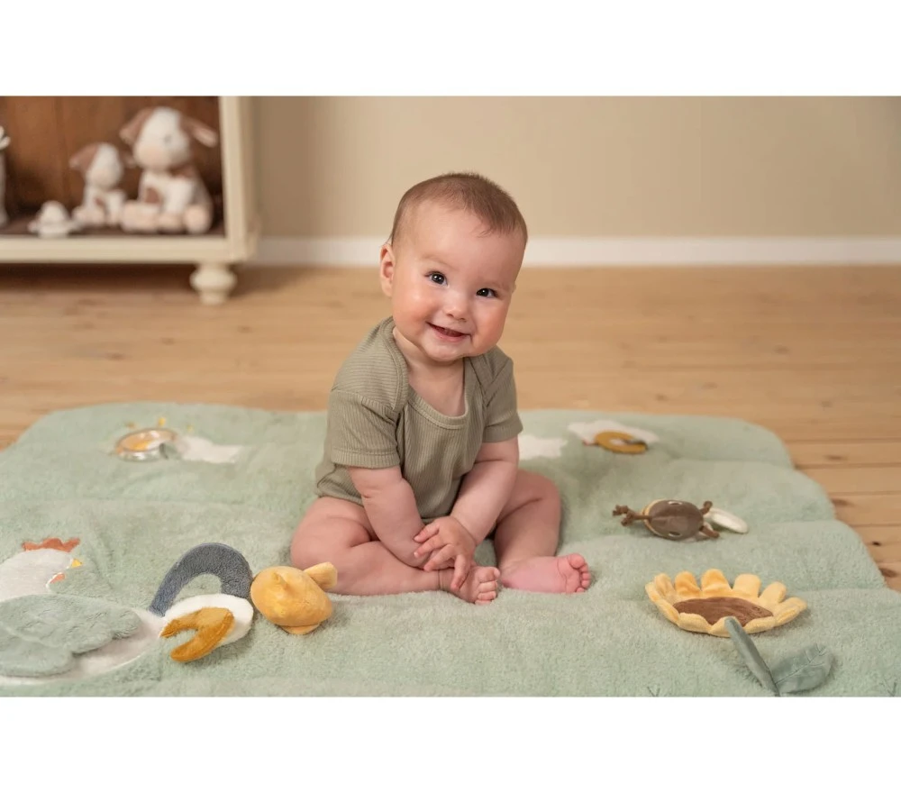 Un grande e morbidissimo tappeto gioco con attività sensoriali diverse, perfette per intrattenere ed incuriosire i più piccini. Della linea Little Farm, il tappeto ha parti fruscianti, sonaglini, uno specchietto, diversi animali e diverse texture da scoprire.