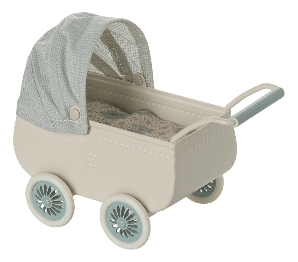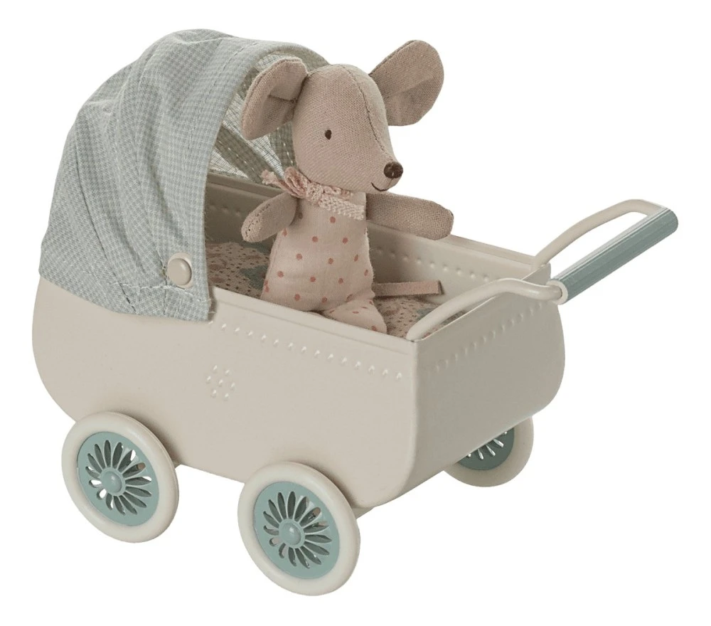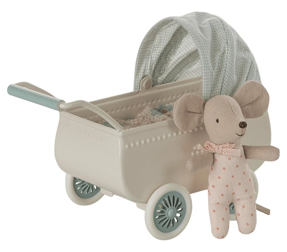 Una splendida carrozzina in metallo con cappottina a quadrettini color menta e un topolino tenerissimo che dorme nel suo sacco nanna.