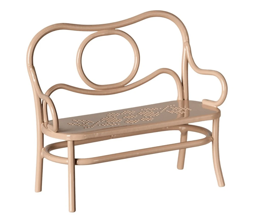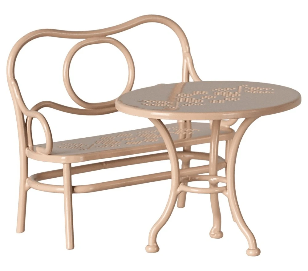 Un elegante set di tavolino e panchina in metallo rosa chiaro per i topini Maileg. Perfetto per il tè delle 5! Adatto alle misure dei topi Mamma/Papà e Nonno/Nonna.