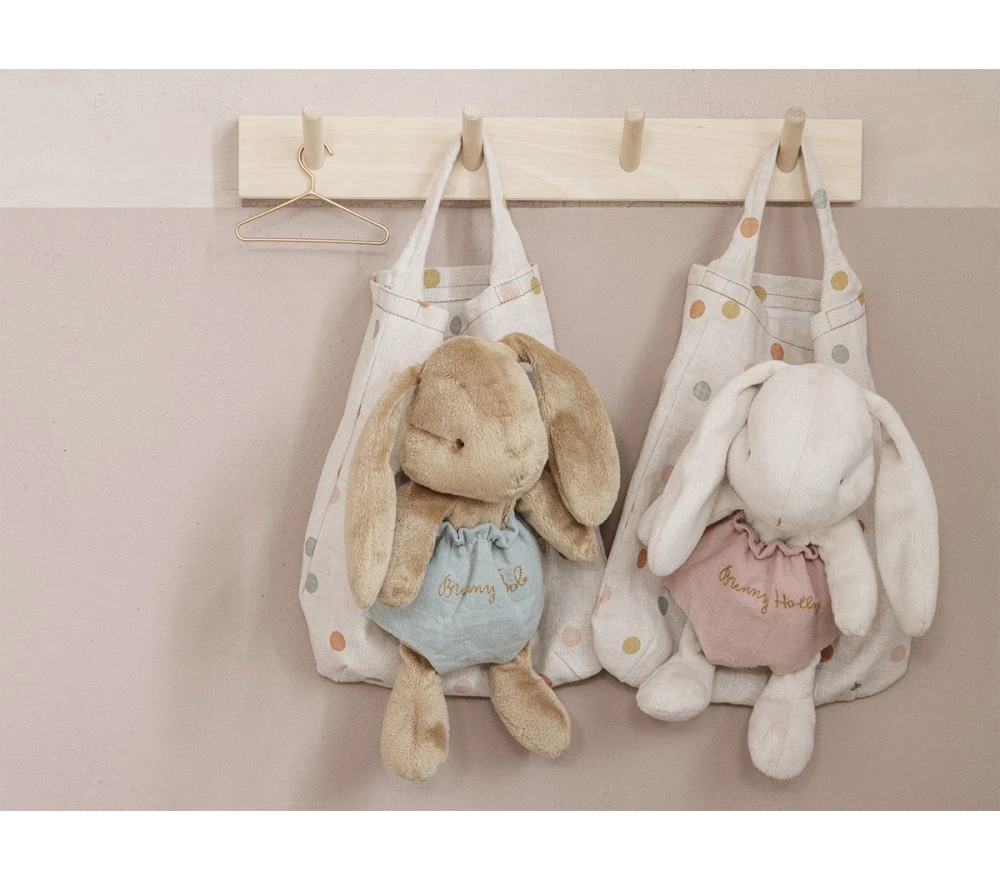 Un dolcissimo coniglietto tutto da coccolare! Il pupazzo ha una simpatica borsa in lino a pois con una tasca, per portare il proprio tenero amico sempre con sè! Alto circa 25 cm. Una bellissima idea anche per un regalo nascita. Da 0 mesi in su.