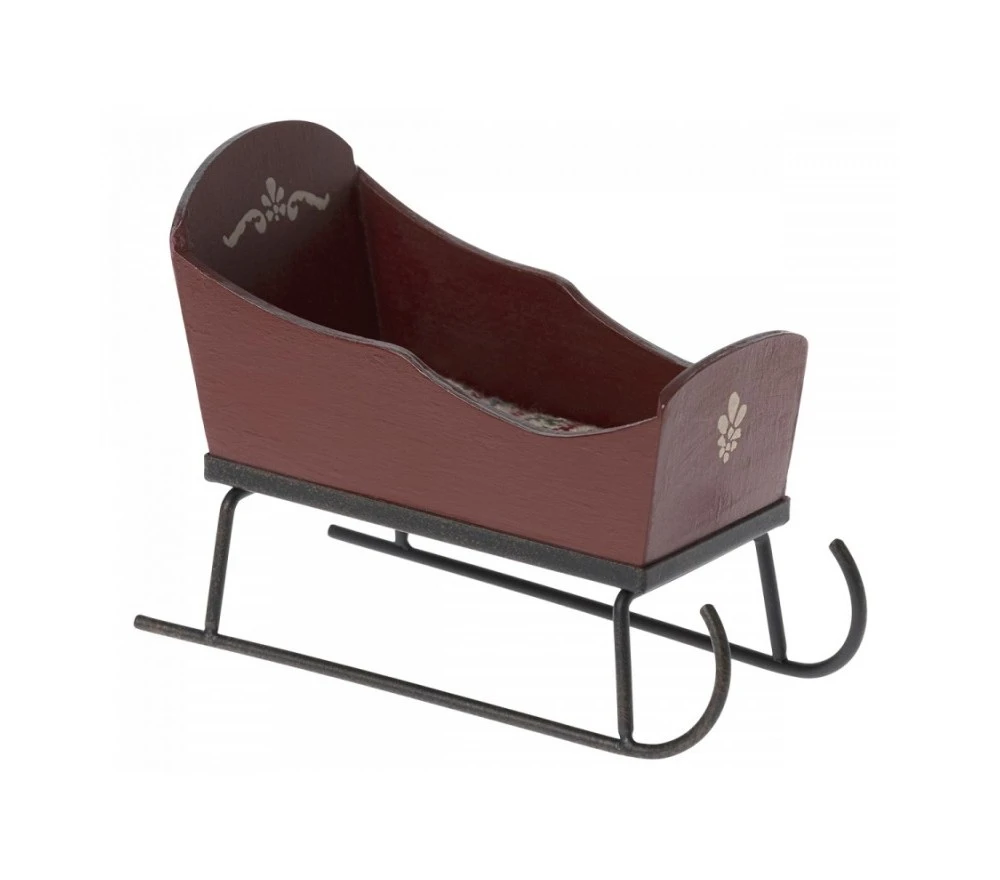 Una slitta, simbolo del Natale, in legno FSC e metallo con una calda coperta, perfetta per i topini Maileg.