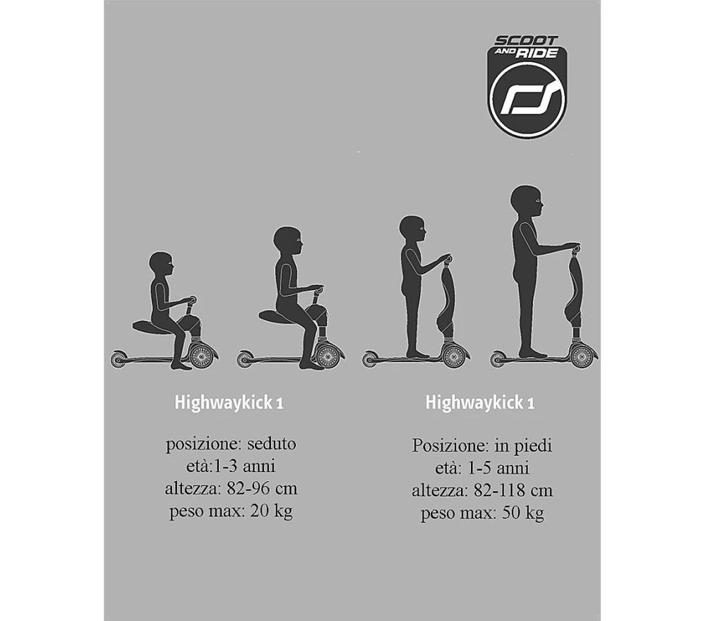 Con un semplice gesto – non servono attrezzi! – si può passare da una modalità all’altra di utilizzo. I bimbi da 1 anno in su potranno utilizzare Highwaykick 1 come cavalcabile, per iniziare ad utilizzare il loro corpo per esplorare il mondo. Quando saranno più grandicelli e fino a 5 anni invece potranno sfrecciare in tutta sicurezza con Highwaykick 1 in versione monopattino a tre ruote.
