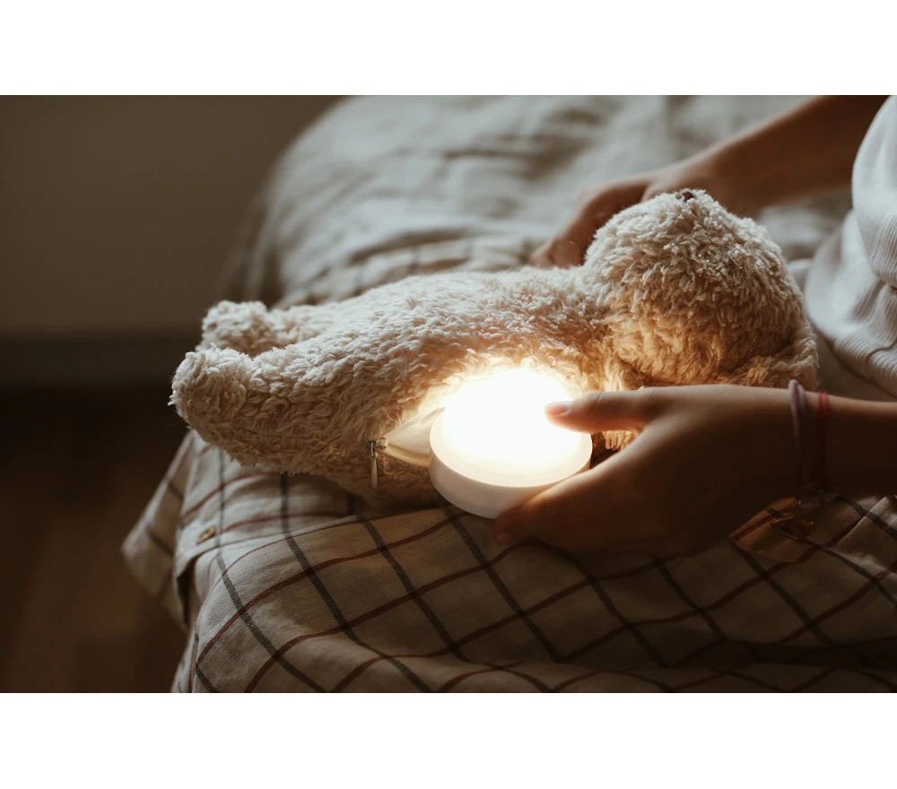 L’orsetto non solo fa da lucina notturna, tenue e calda, ma riproduce anche suoni rilassanti ed è in grado di rilevare il pianto del bambino per attivarsi.