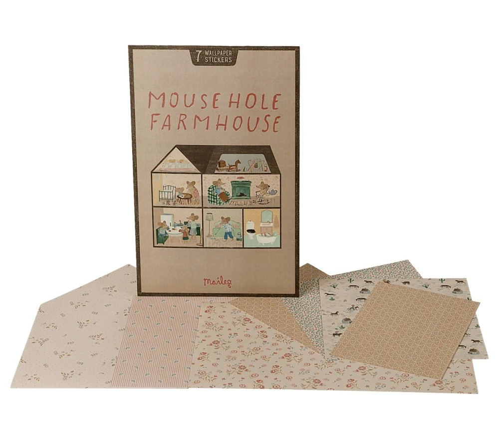 Un set di carta da parati adesiva per la casa Farmhouse dei topini Maileg. 7 stickers, uno per ogni stanza, per portare colore e allegria!