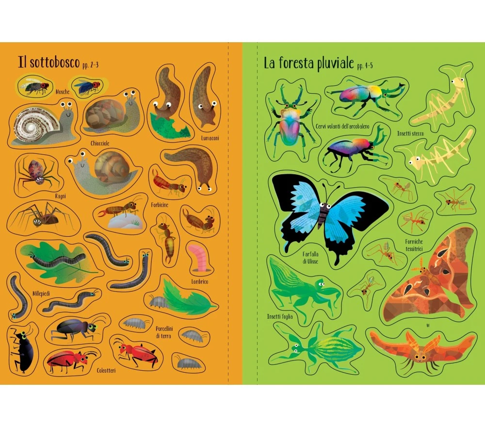 Quanti insetti da scoprire in giro per il mondo! I bambini si divertiranno a riempire le scenette di questo simpatico libro con gli adesivi forniti, che sono riutilizzabili più e più volte.