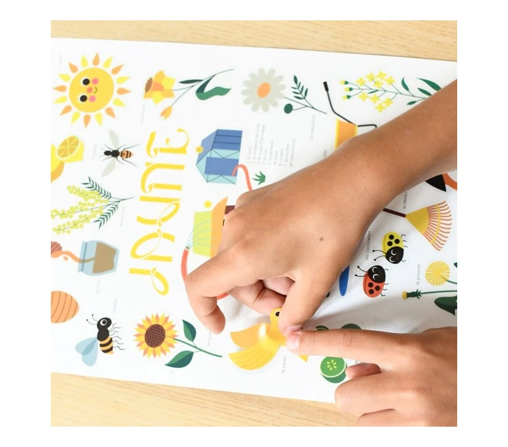 Un poster (21 x 30) tutto da completare con i 24 stickers a tema giardino, con elementi tutti accomunati dal colore giallo. Un gioco educativo, creativo e stimolante!