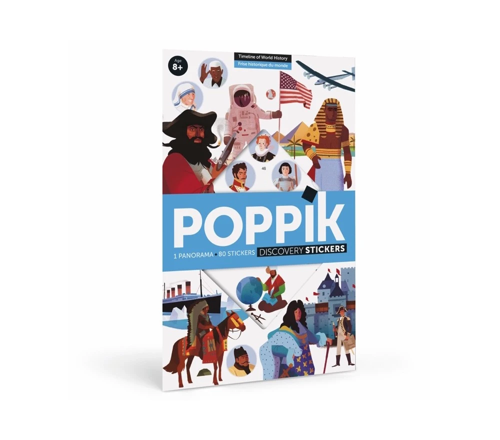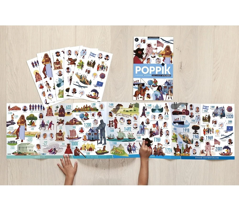 Un grande (135 x 30 cm) poster con le tappe della storia dell’umanità e i suoi personaggi più famosi, da completare con gli 80 stickers. Un gioco educativo, creativo e stimolante!