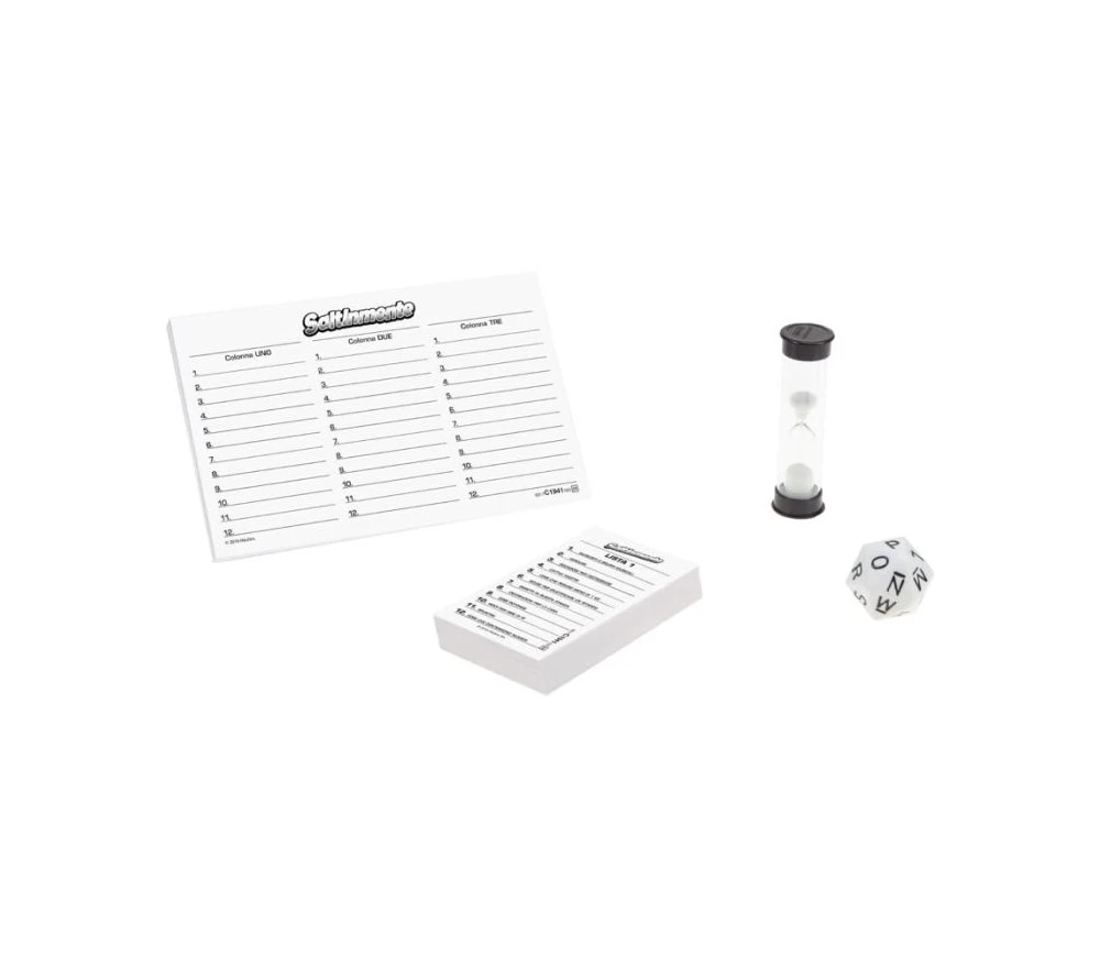 Saltinmente è un grande classico in cui dopo aver estratto casualmente una lettera (con il dado a 20 facce in dotazione), i giocatori devono trovare delle parole appartenenti alle categorie segnate sulla carta-categoria che inizino con quella lettera.