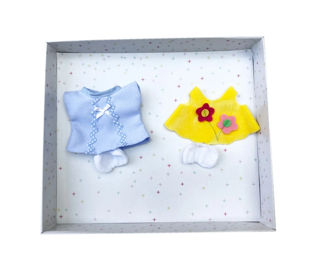 Un set di due abitini per le Pepotes di Nines’d’Onil. Gli abiti sono confezionati in un’elegante scatola in cartone stampato, con finestra trasparente. 100% realizzato in Spagna. Da 4 anni in su.