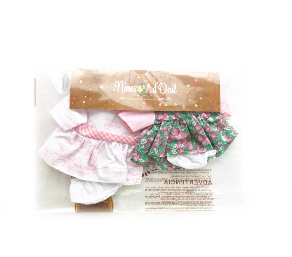 Un set di due abitini per le Pepotes di Nines’d’Onil. Gli abiti sono confezionati in un sacchetto trasparente. 100% realizzato in Spagna. Da 4 anni in su.