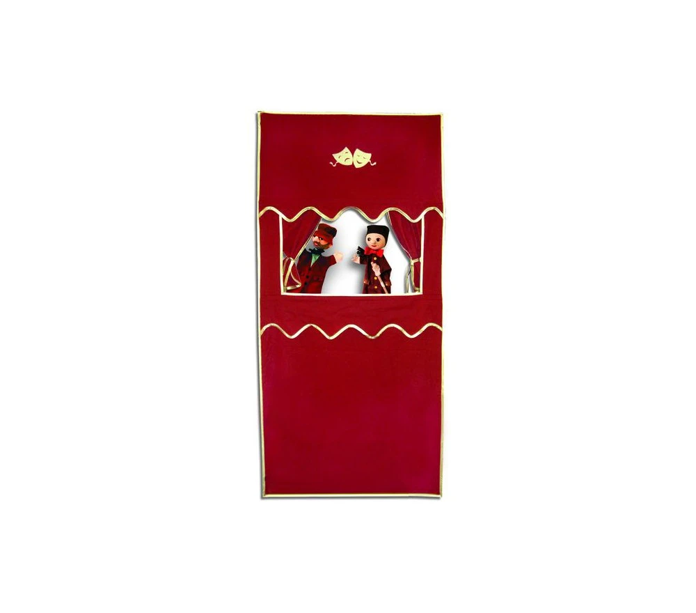 Un comodo teatro per marionette e burattini in stoffa da appendere allo stipite di una porta. Si piazza in un attimo e l’atmosfera è creata!