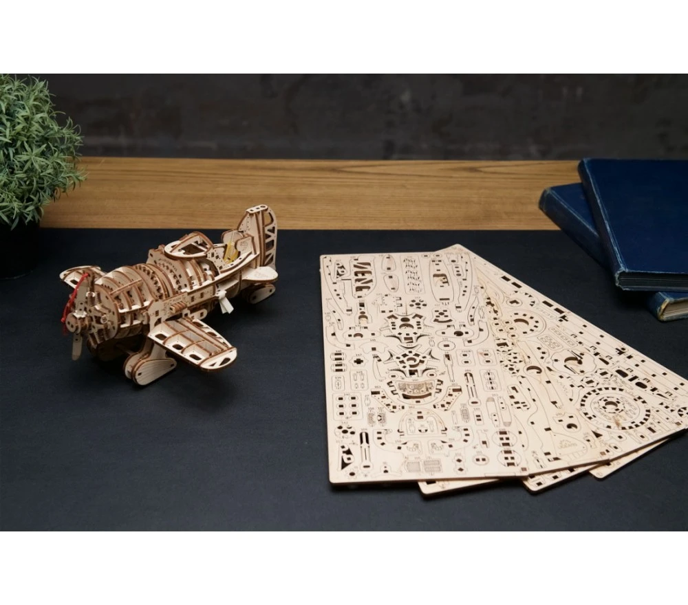 L’aeroplano Mad Hornet di Ugears è un modello di difficoltà « media », composto da 354 parti, che promette 8 ore di piacevole montaggio. Il modello di aereo è alimentato da un motore a molla elicoidale, spesso utilizzato nei meccanismi degli orologi e in altri strumenti di precisione. Diversi gruppi d’ingranaggi trasmettono l’energia dalla molla alle parti mobili dell’aereo.