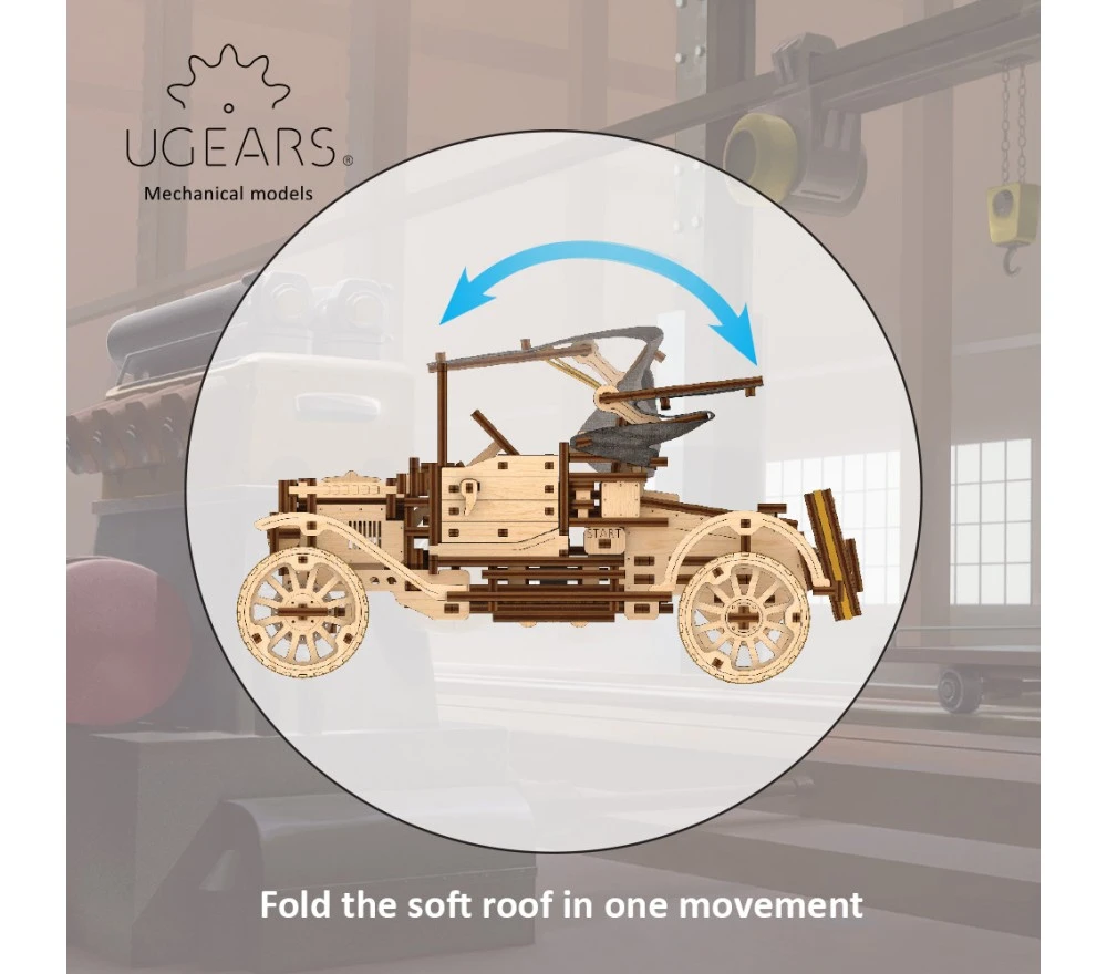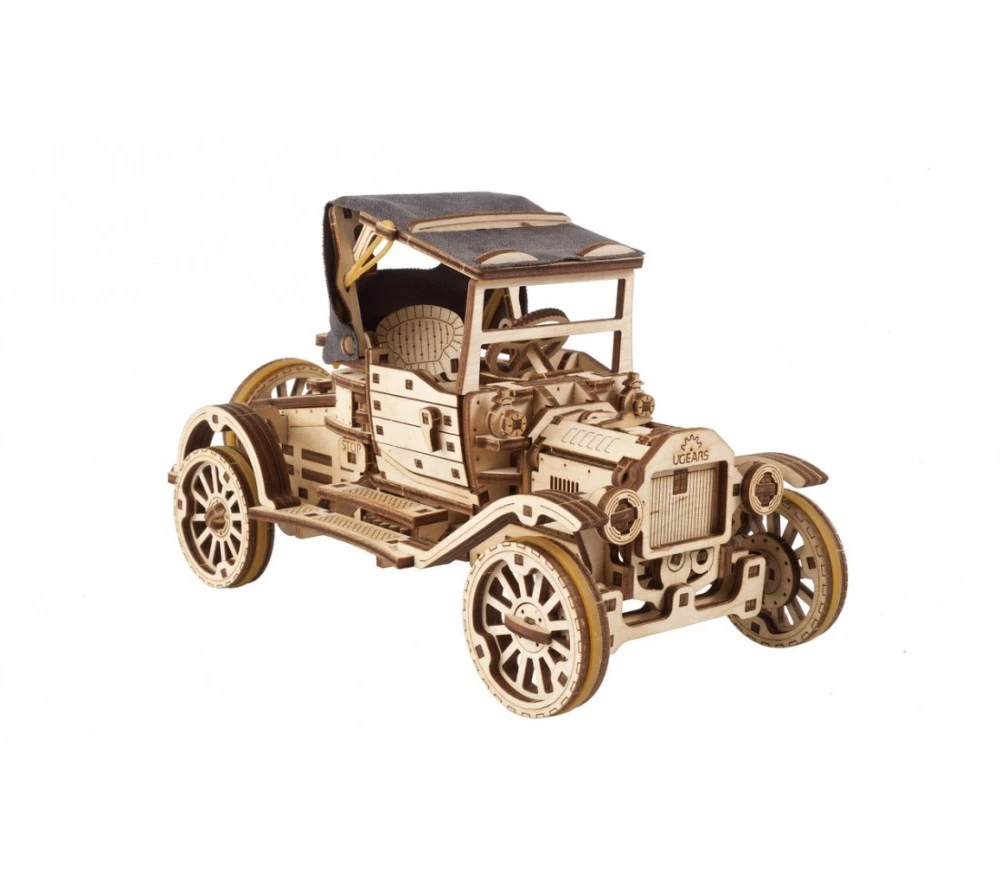 Il team di ingegneri e designer di Ugears ha sviluppato uno speciale modello di auto d’epoca per riportarti a quell’età. Le caratteristiche eccezionali includono il funzionale tetto pieghevole convertibile con rivestimento in tessuto; porte della cabina con chiusura a scatto che si aprono sul davanti; il cofano che si apre su entrambi i lati, rivelando un funzionale motore 4 cilindri con albero a gomiti; un pendolo schizomorfo che simula il suono di un motore rombante; ruote anteriori che girano utilizzando il volante; e una ruota di scorta montata sul retro. Per azionare la Retro Car UGR-T, impostare il pulsante Start/Stop su « Stop » mentre si carica il motore a molla utilizzando la chiave a cricchetto incorporata sotto il telaio. Posiziona il modello su una superficie piana mentre lo tieni con una mano, premi « Start », quindi rilascia e guardalo andare. L’auto ha le marce avanti, folle e retromarcia.