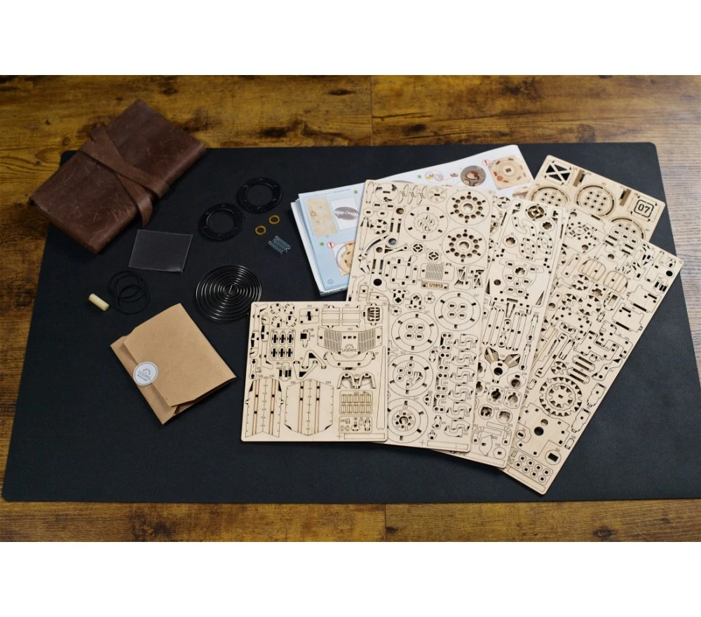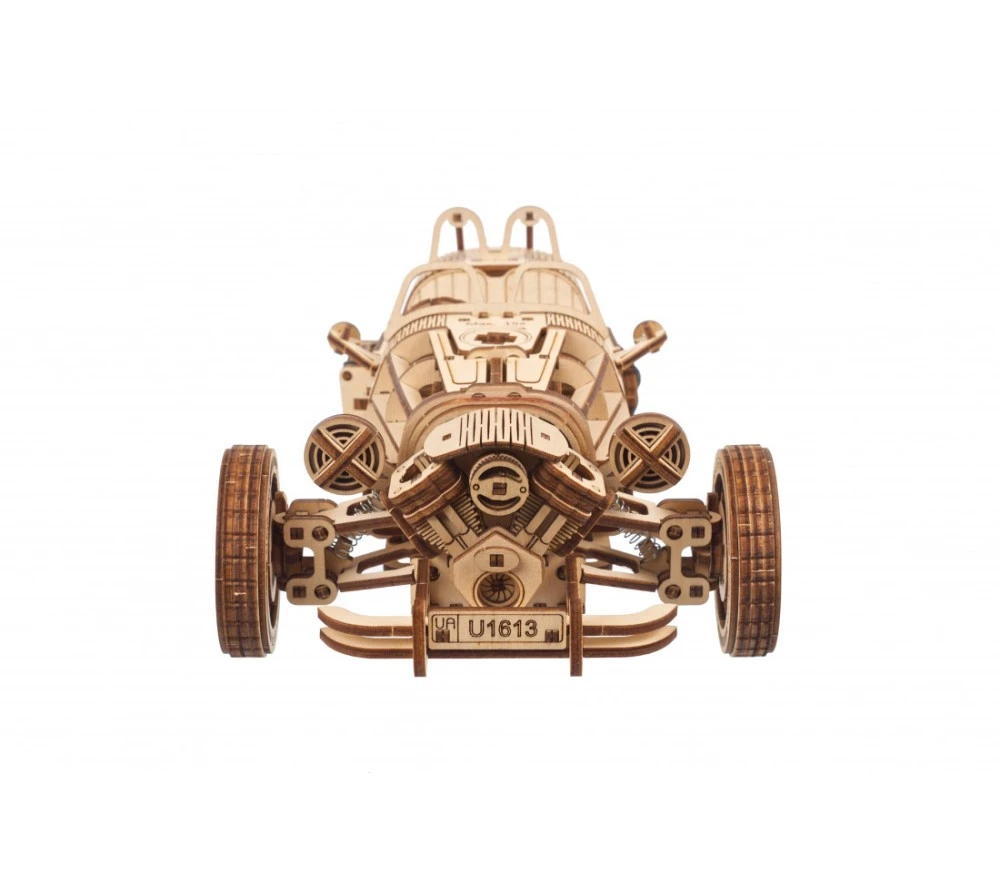 E non è tutto: sollevando i due lati del cofano motore potrai vedere il serbatoio della benzina e il motore a molla! L’UGR-S a Tre ruote di Ugears può percorrere circa 4 metri in linea retta, oppure, girando le ruote a mano o con il volante, è in grado di compiere curve aggraziate. Il sistema di propulsione dell’UGR-S a Tre Ruote comprende il motore a molla e un’esclusiva trasmissione a catena alla ruota posteriore, una novità assoluta nel catalogo Ugears. Questo modello di veicolo a tre ruote in legno fai da te è dotato di una chiave di carica rimovibile che può essere riposta in uno dei vani portaoggetti sul lato del modello. Posiziona il cambio in modalità « Park », inserisci la chiave nel cofano, esegui fino a 15 giri, quindi avvia il triciclo spostando il cambio in modalità « Drive ». Osserva i bellissimi pistoni e la trasmissione a catena in azione mentre il triciclo parte nella direzione desiderata.