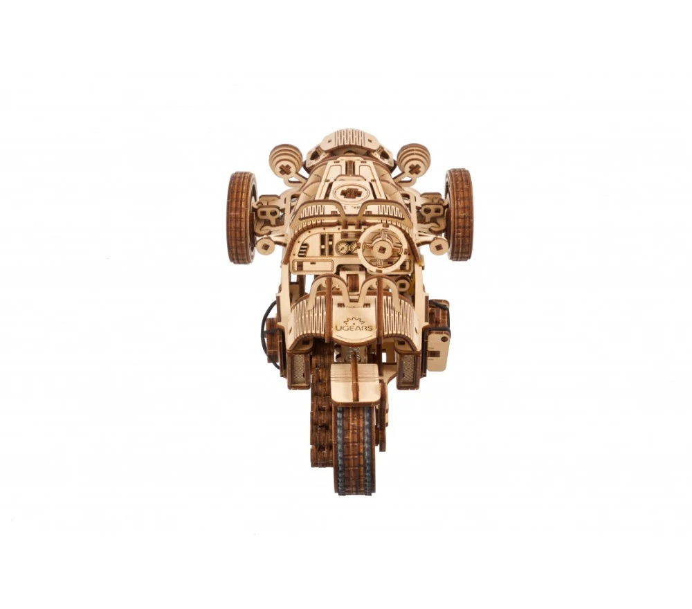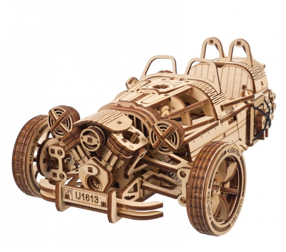 L’UGR-S a tre ruote è l’ultima creazione della collezione di moto e automobili Ugears. Questa elegante biposto è una tre ruote in perfetto stile britannico.